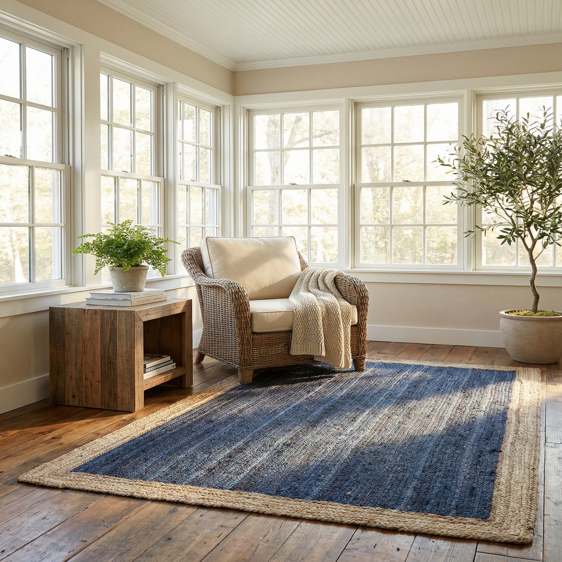 Works well in casual coastal, farmhouse, or transitional settings. Pair it with light wood furniture and white or linen upholstery for a relaxed living room, use it under a round wood dining table to anchor the space, or place it in an entry or mudroom to introduce durable texture and color contrast. Navy pairs cleanly with brass or matte black accents and with tan leather or woven rattan pieces for a cohesive, layered look.