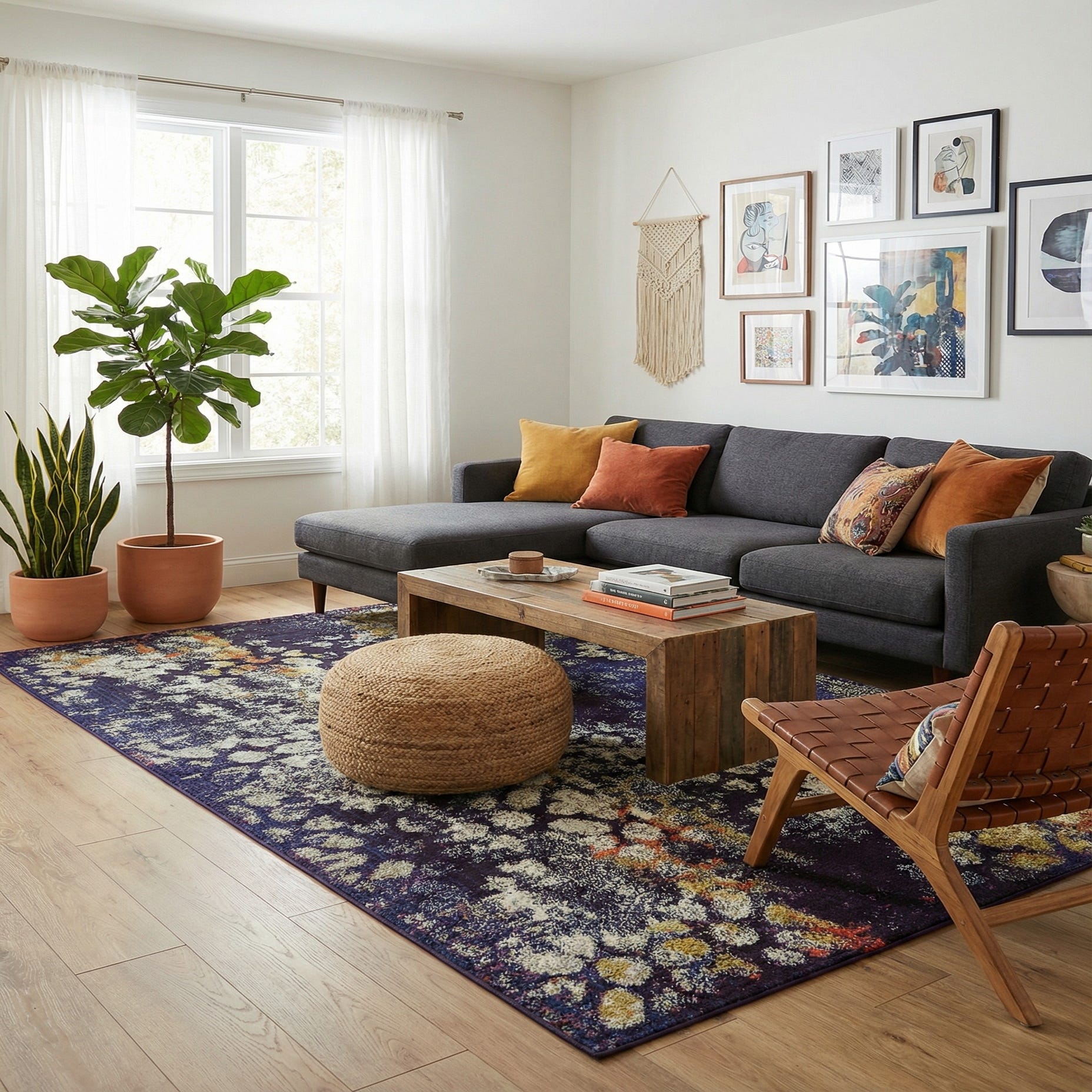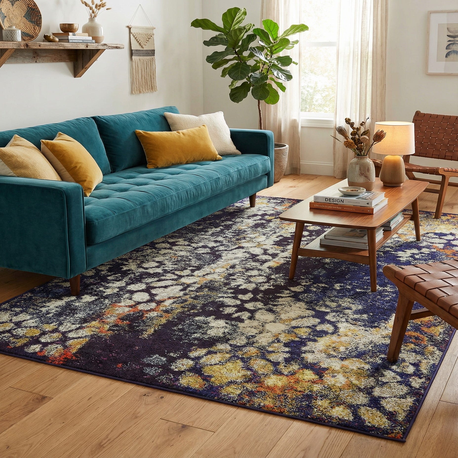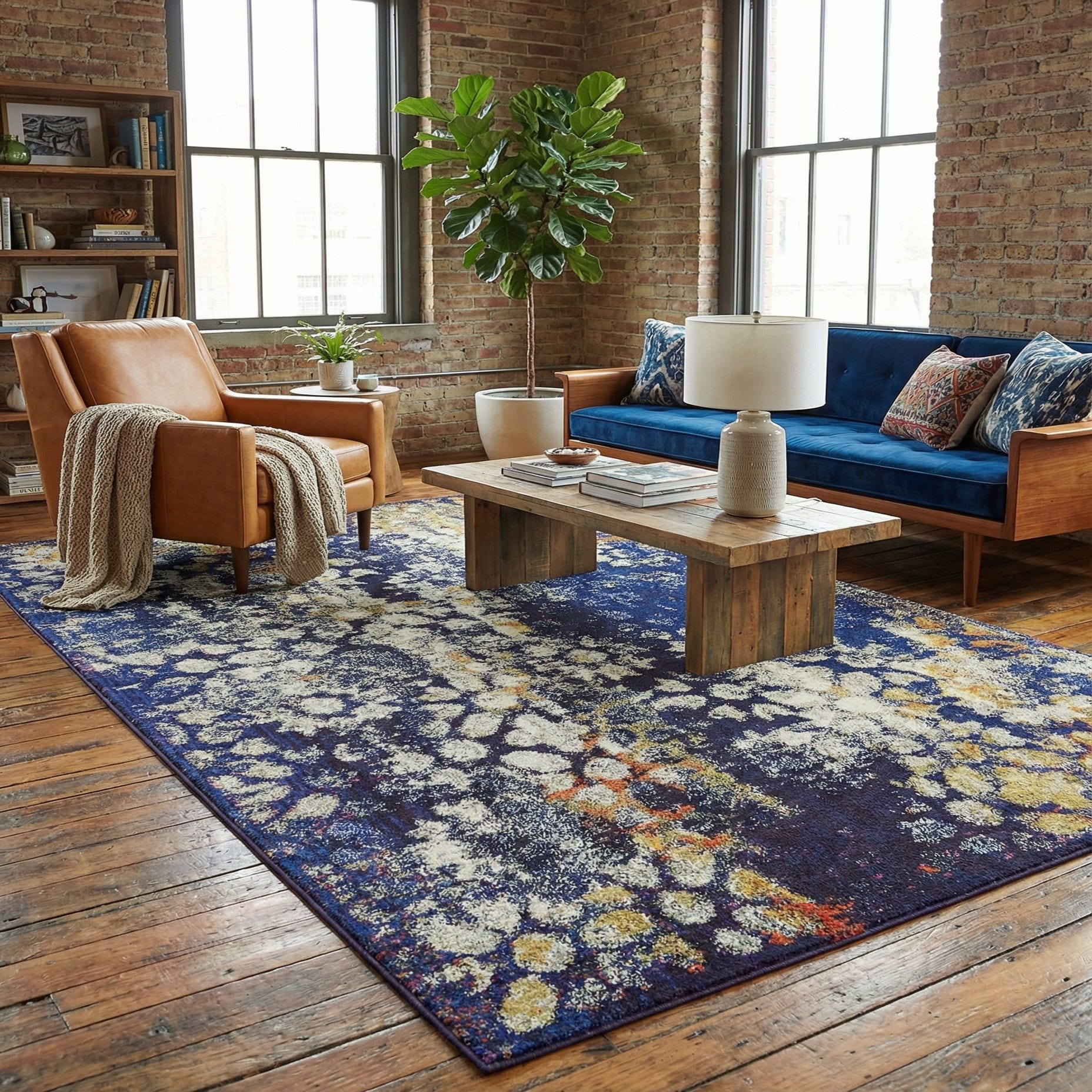 Machine-made from 100% polypropylene, the rug has a low-to-medium pile that feels smooth with a slight cushioning underfoot; the dense synthetic fibers create subtle texture where the lighter motifs sit against the darker navy field. It works especially well in contemporary or transitional living rooms—place it under a coffee table to anchor seating—or in a bedroom at the foot of the bed to introduce pattern and warmth. The palette pairs nicely with warm wood tones, brass or matte-black accents, leather furnishings, and accent pillows in ivory, mustard or burnt orange for a cohesive, layered look.
