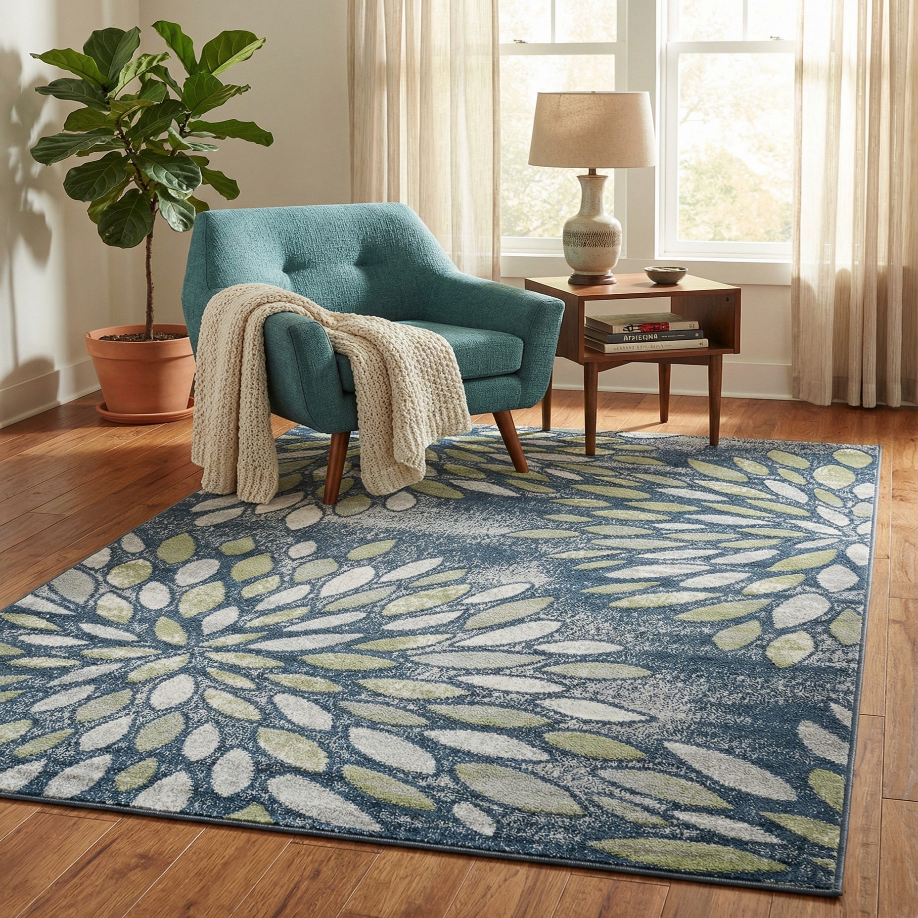 Machine-made from 100% polypropylene, this rug has a low, dense pile that feels smooth and slightly springy when you run your hand across it. A deep navy blue ground sets the stage for an abstract botanical pattern of elongated petal shapes in ivory, light green and gray. The petals are arranged in radiating clusters that form large floral motifs, while a subtle distressed texture in the background adds visual movement and layered depth to the overall design.