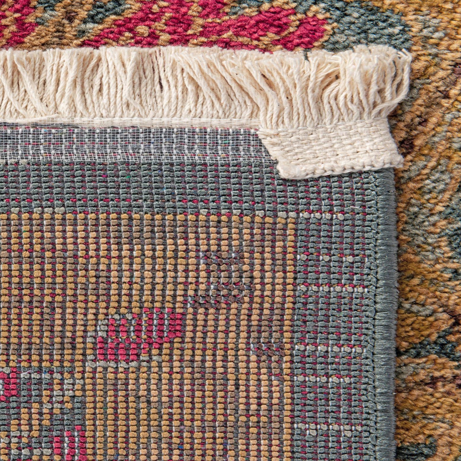 A 5x8 rectangular navy blue and gold rug with a detailed botanical and floral pattern, featuring red accents and a traditional border.