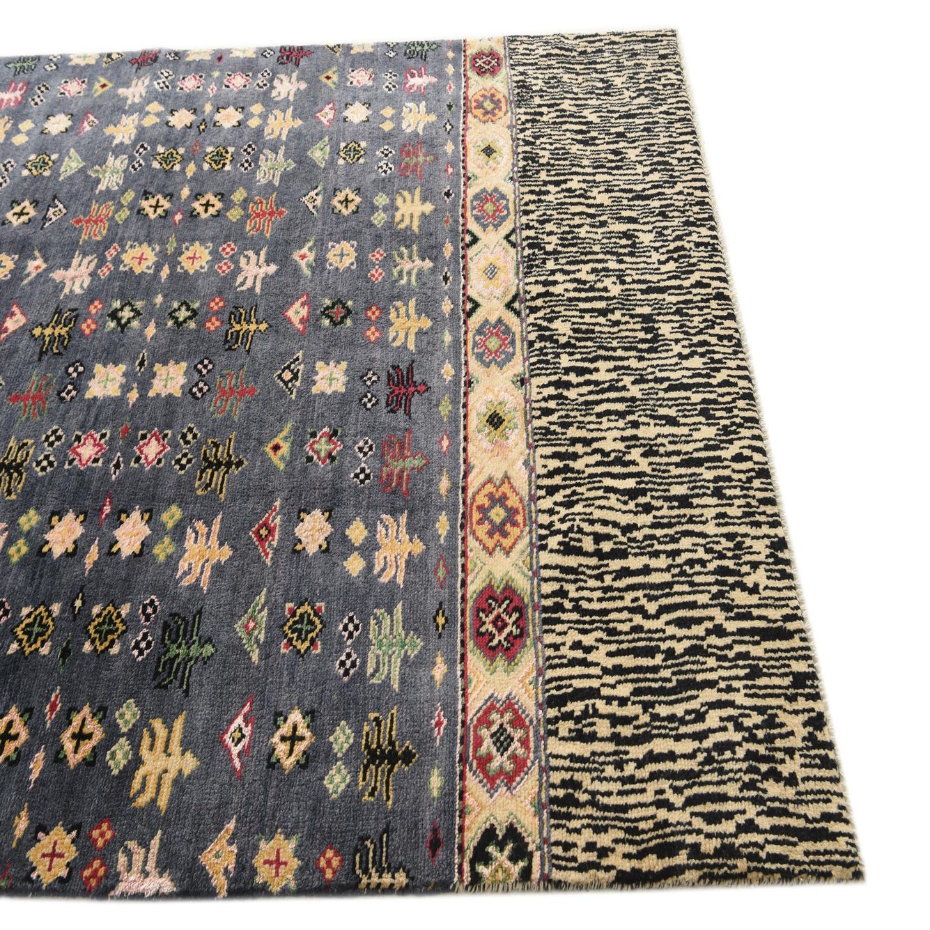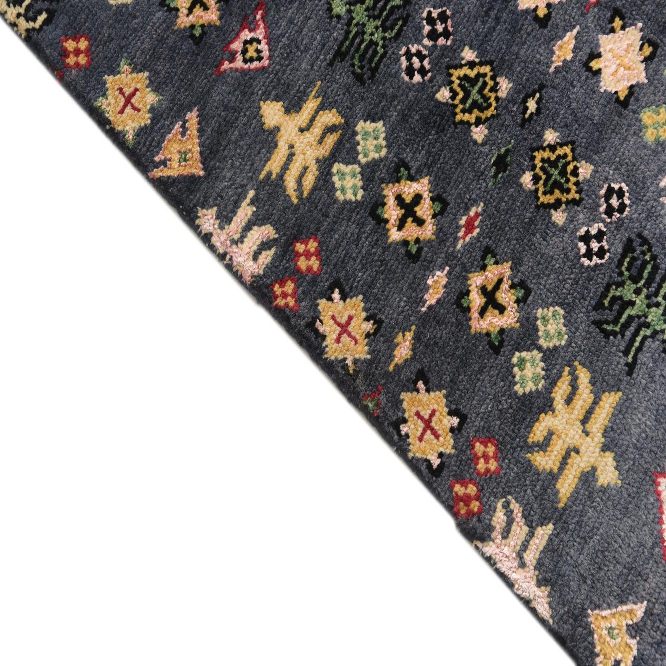 Primary color is Navy Blue. Colors in this rug include: Navy Blue, Black, Ivory, Red, Yellow, Gray, Green.