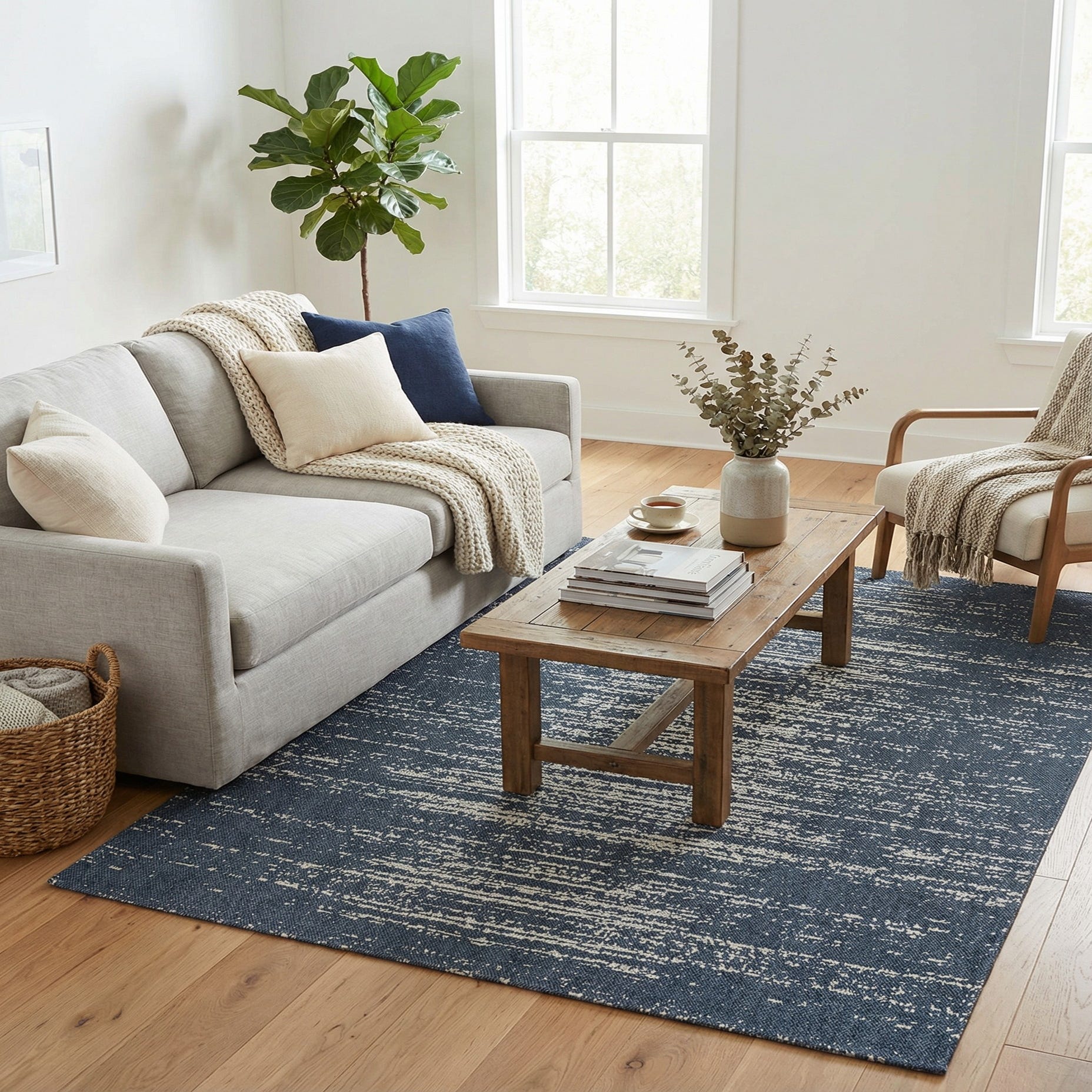 Machine-made from 100% cotton, the rug has a flat-woven, low-profile surface with a slightly nubby hand that feels soft underfoot and lies flat in high-traffic areas. The texture and neutral palette make it easy to pair with light woods, white or natural upholstery, and mixed-metal accents. Place it under a coffee table to anchor a seating group, layer it in a bedroom to add warmth at the foot of the bed, or use it in a casual dining area or home office to introduce pattern without overwhelming the room.
