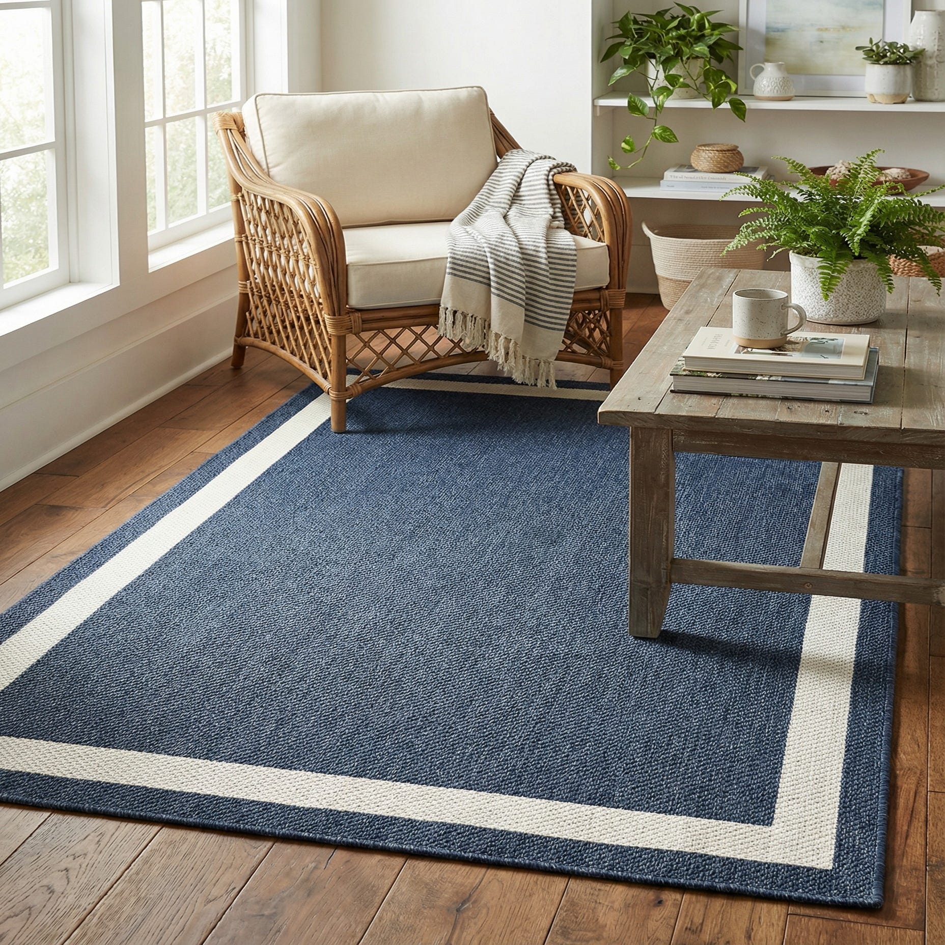 Place it to anchor a seating group in a living room, layer it over hardwoods in a dining nook, or set it at the foot of a bed to add contrast and definition. The navy-and-ivory combination complements light woods, brass or matte-black accents, and neutral upholstery—ideal for coastal, preppy, or modern-traditional schemes that benefit from a grounded, orderly foundation.