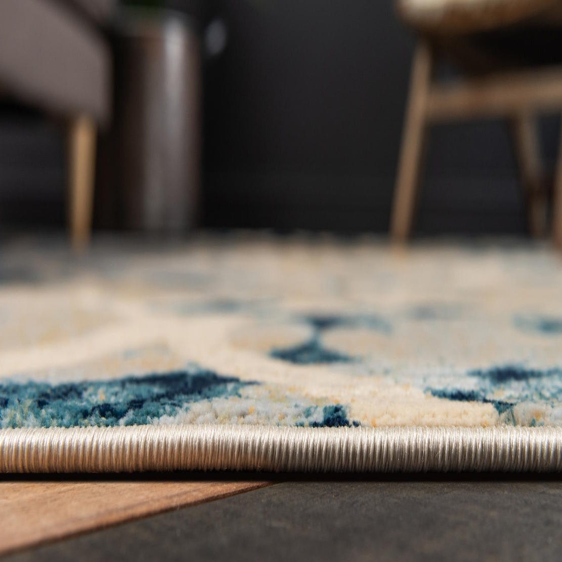 Primary color is Navy Blue. Colors in this rug include: Navy Blue, Beige, Gray, Tan, Light Blue.