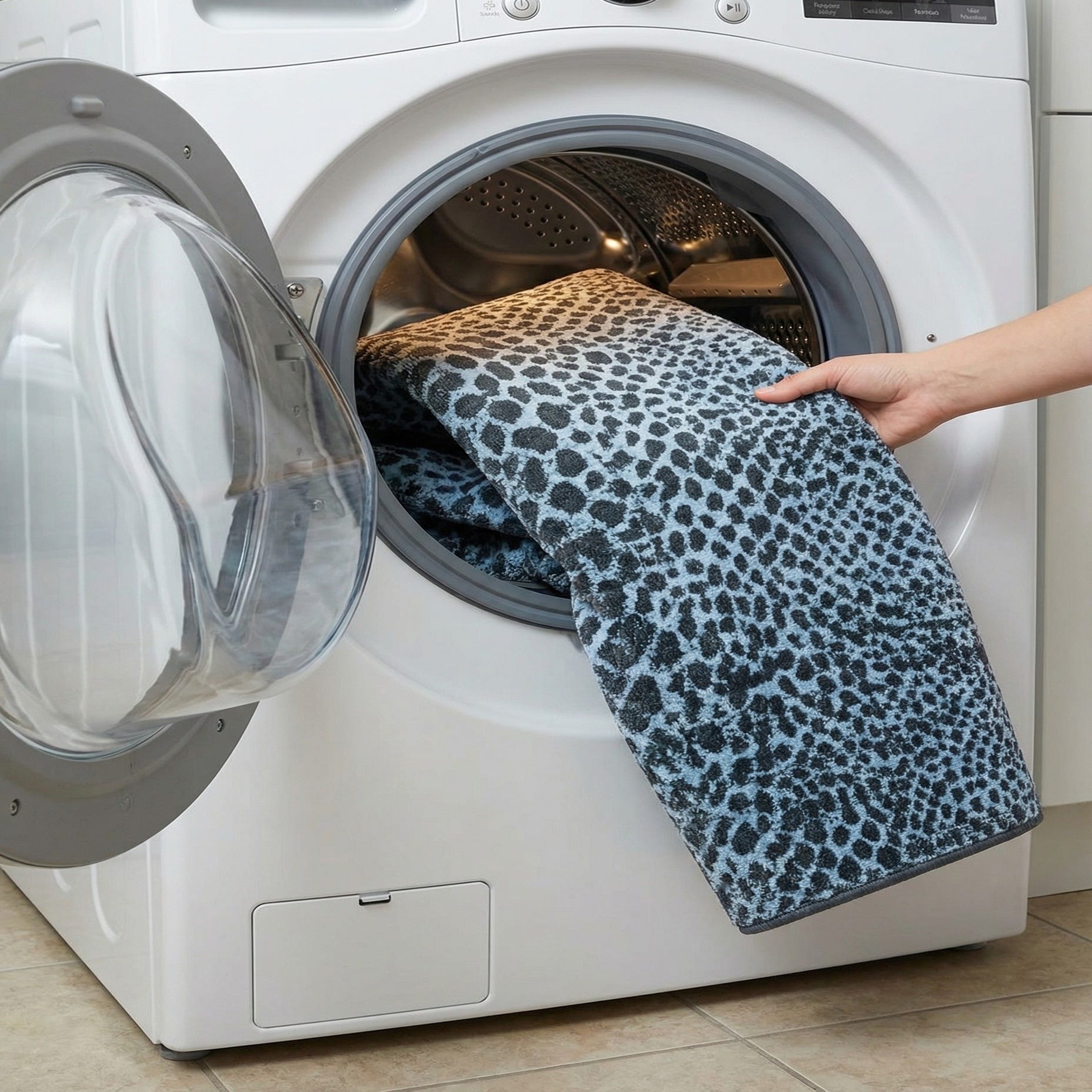 A 5x8 rectangular Kamala Washable rug featuring a modern abstract pattern of dark blue spots on a lighter blue background.