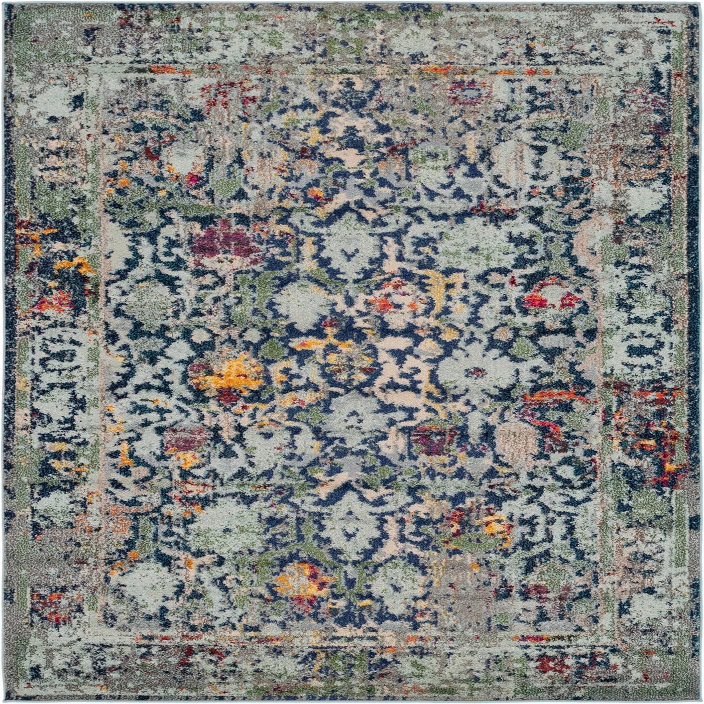 Primary color is Navy Blue. Colors in this rug include: Navy Blue, Blue, Green, Ivory, Red, Turquoise, Yellow, Pink, Olive.