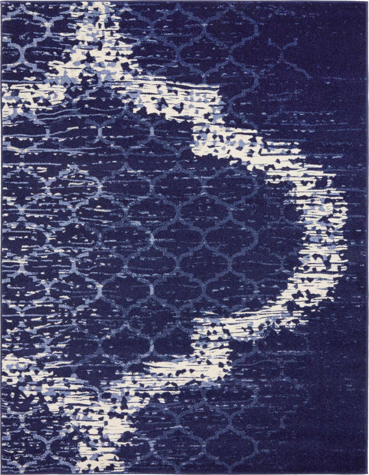 Primary color is Navy Blue. Colors in this rug include: Navy Blue, Beige, Cream, Light Blue.