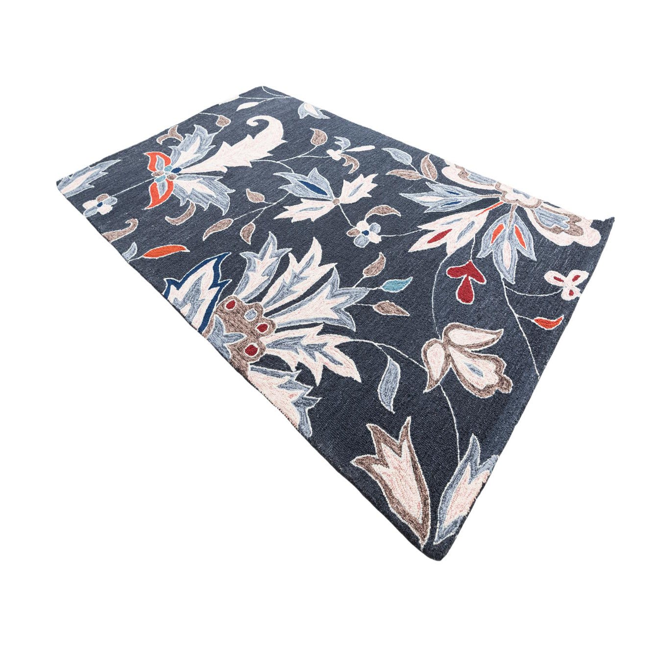 The Luna Collection presents a 5x8 hand-tufted area rug crafted from a blend of wool and cotton. The rug features a navy blue background imbued with a vibrant botanical pattern that includes hues of gray, ivory, orange, red, and brown. The design showcases a mix of stylized florals and leaves, offering an eye-catching element to any interior space.