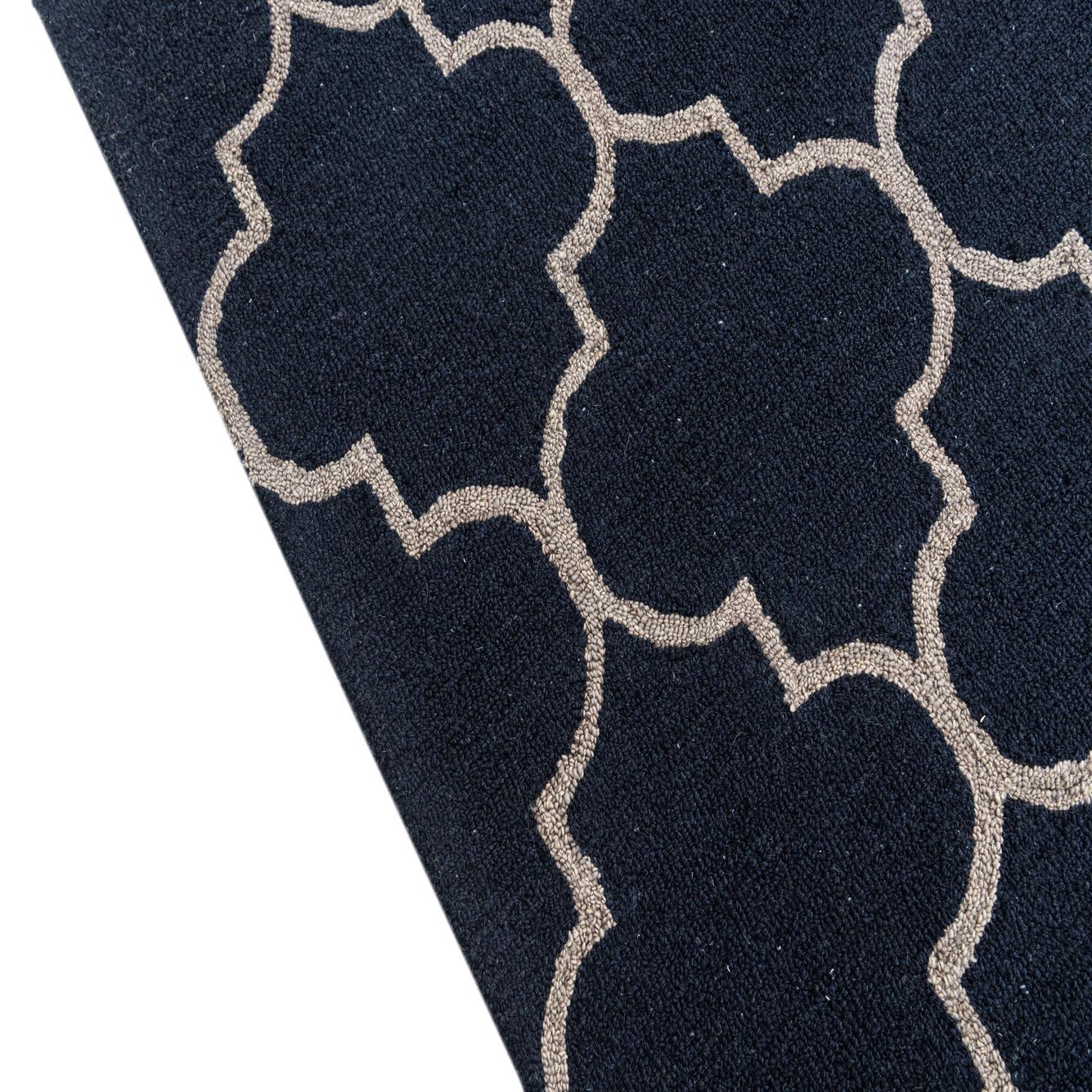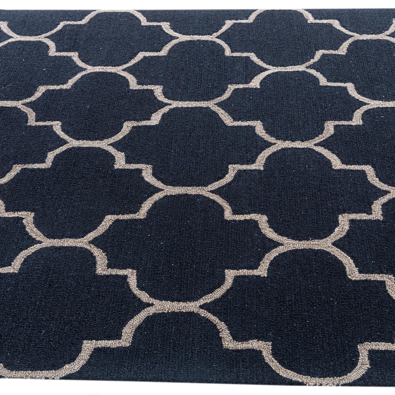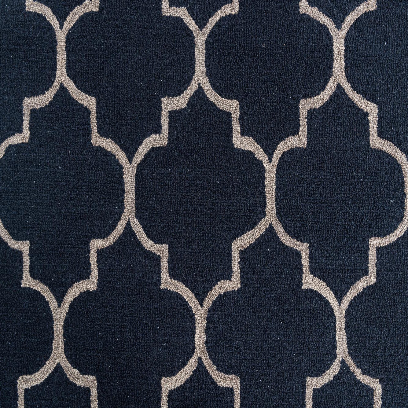 The Luna Collection presents a 5x8 hand-tufted rug crafted with a blend of wool and cotton, offering a plush feel alongside durability. This piece features a timeless trellis pattern, articulated through crisp, geometric shapes that create a sense of rhythm and continuity across the surface. The navy blue backdrop is punctuated by a beige outline, resulting in a sophisticated contrast that accentuates the defined contours of the design.