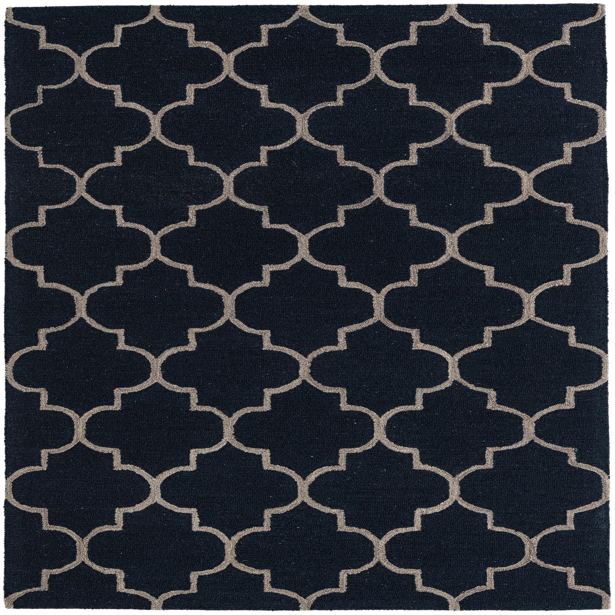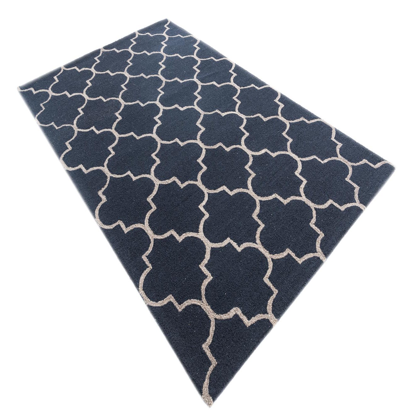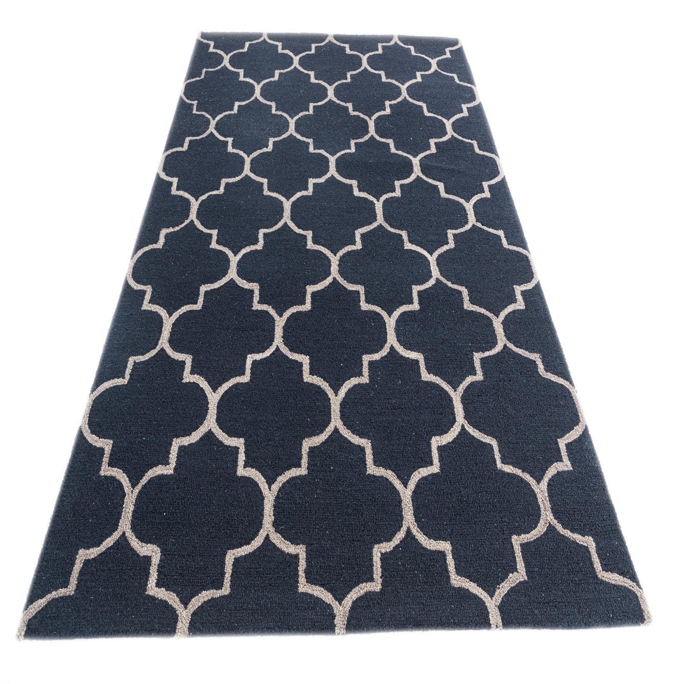 The Luna Collection presents a 5x8 hand-tufted rug crafted with a blend of wool and cotton, offering a plush feel alongside durability. This piece features a timeless trellis pattern, articulated through crisp, geometric shapes that create a sense of rhythm and continuity across the surface. The navy blue backdrop is punctuated by a beige outline, resulting in a sophisticated contrast that accentuates the defined contours of the design.