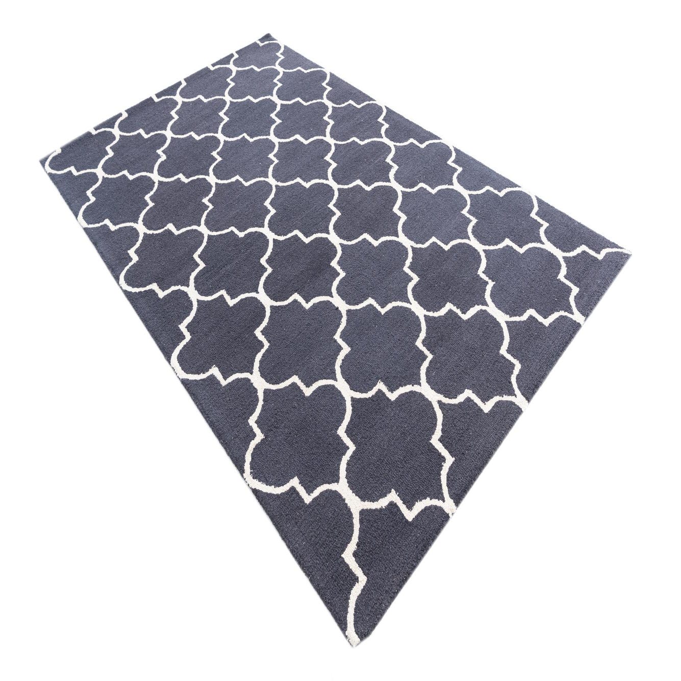 A 5x8 rectangular Luna rug by Rugs.com with a modern navy blue background and an abstract off-white quatrefoil pattern.