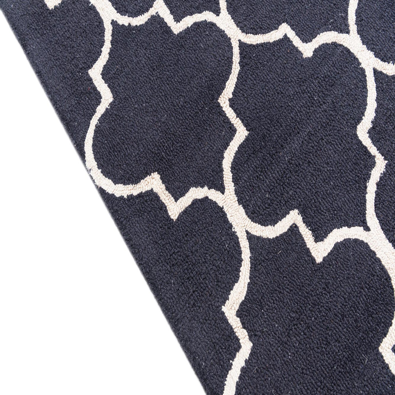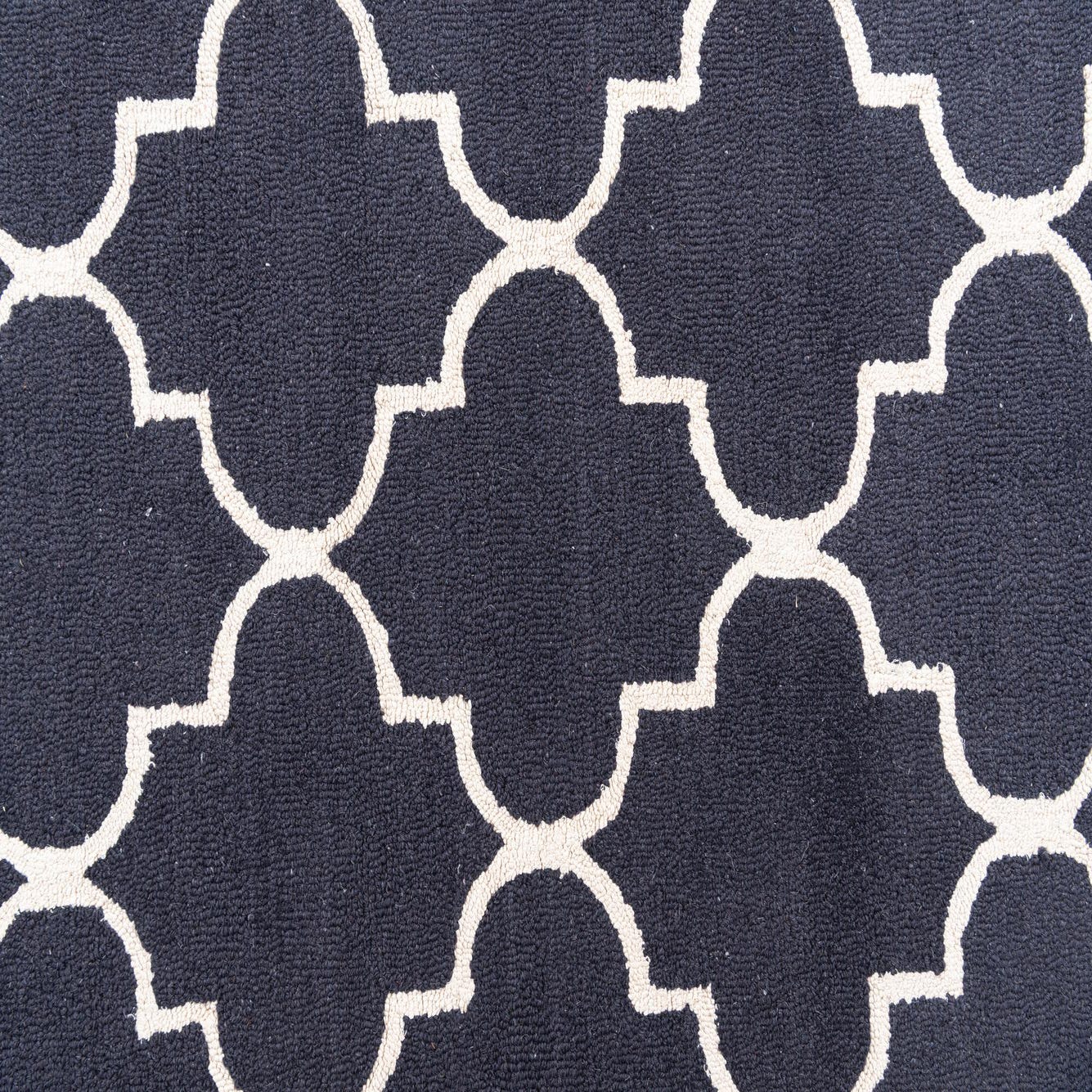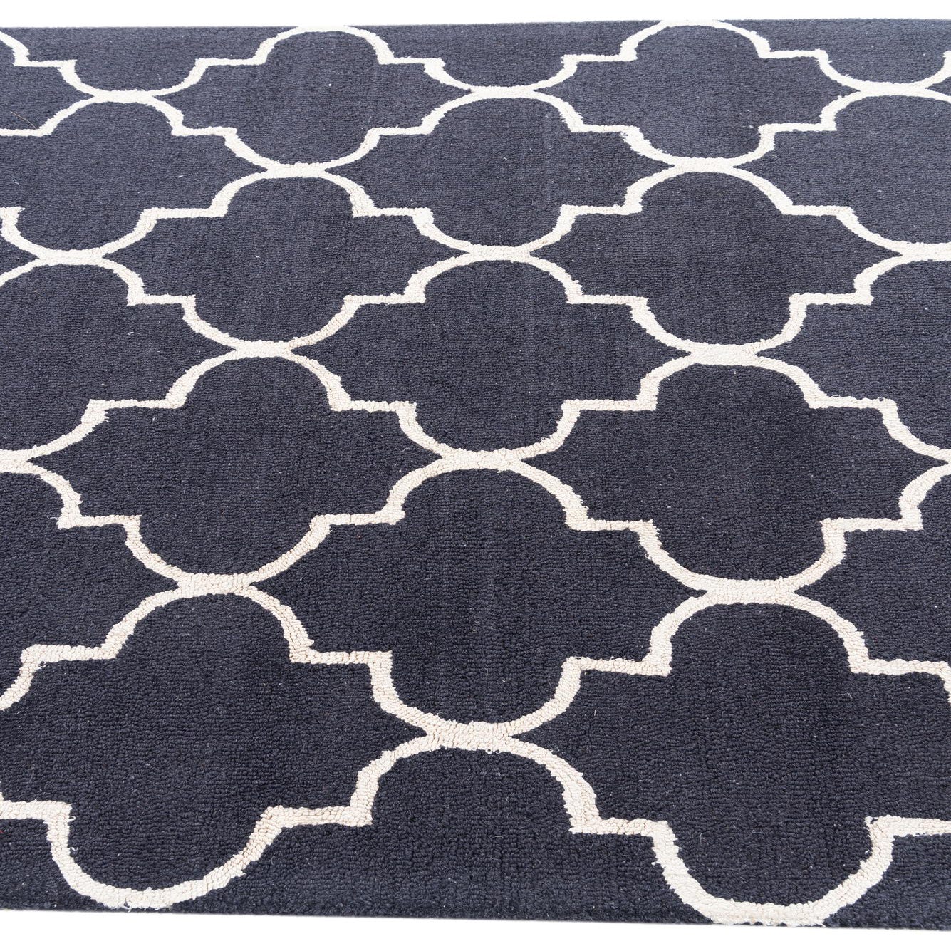 Deep navy provides a rich, grounding field for a crisp ivory arabesque trellis that repeats in an even, geometric rhythm. Hand-tufted of wool and cotton, the ivory motif is slightly raised against a low-to-medium pile navy background, offering a pleasant tactile contrast underfoot and a neat, tailored appearance across the floor.