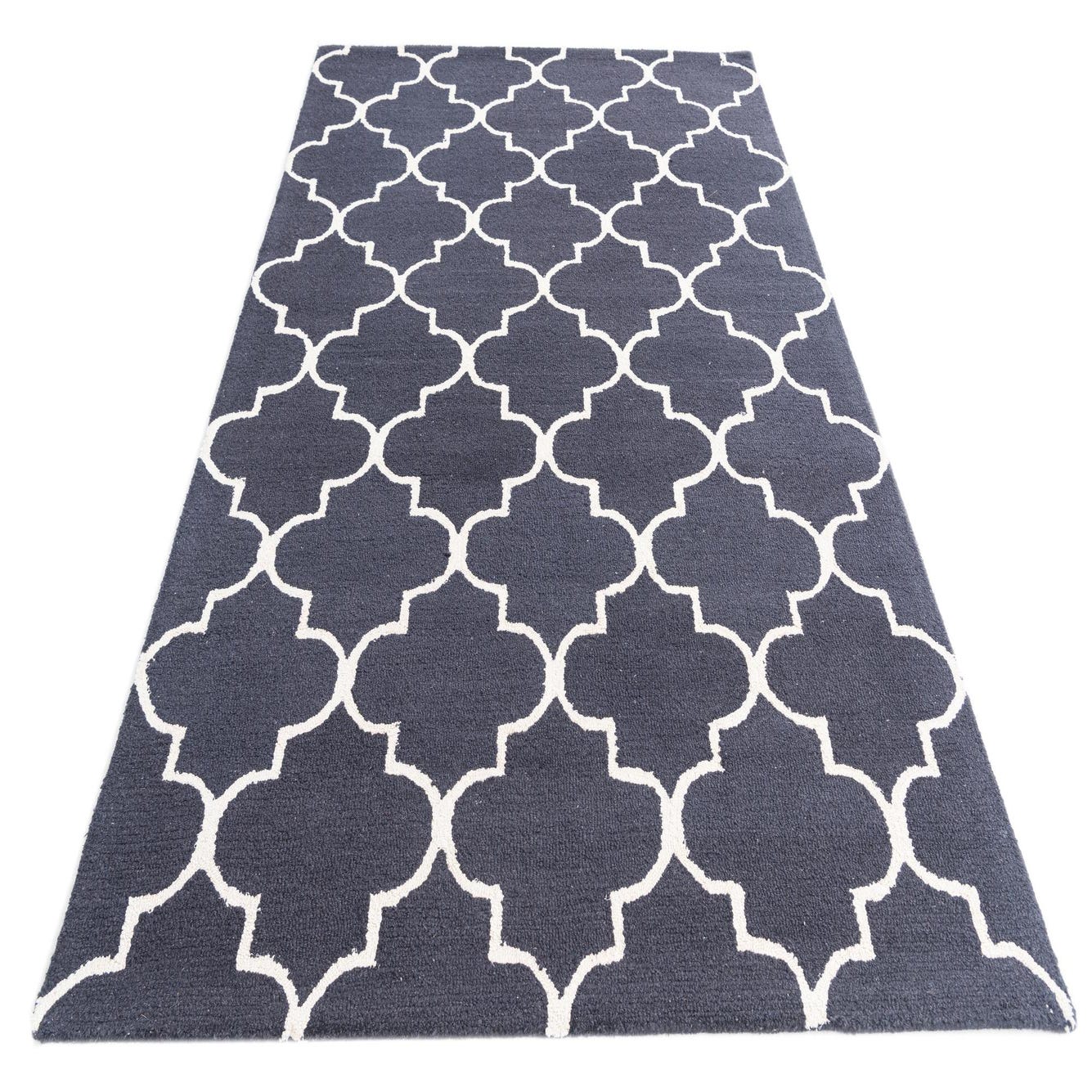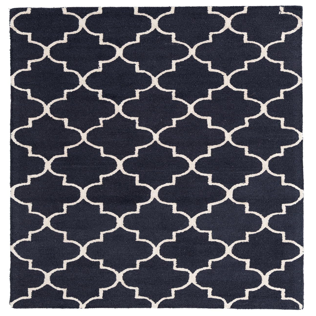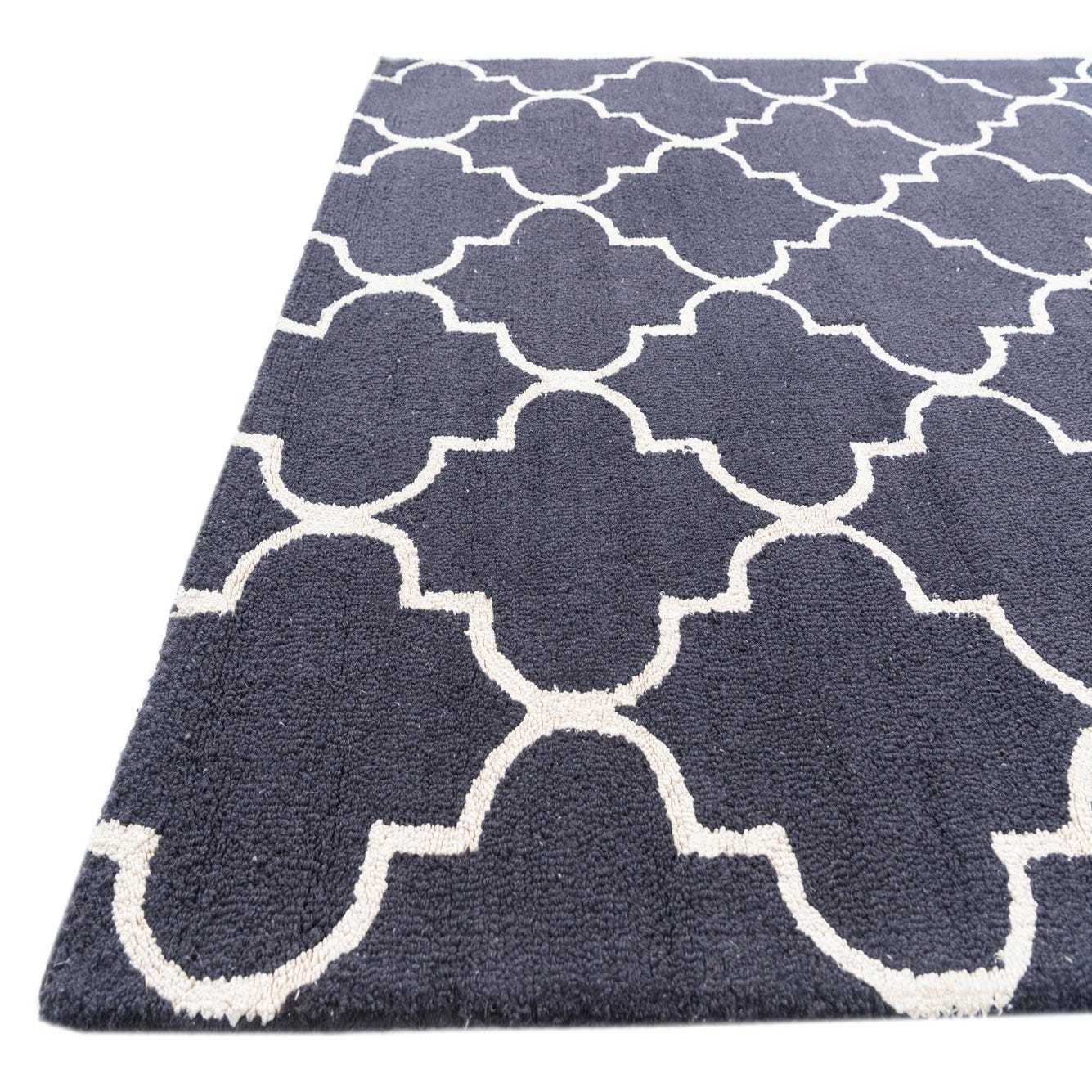 Deep navy provides a rich, grounding field for a crisp ivory arabesque trellis that repeats in an even, geometric rhythm. Hand-tufted of wool and cotton, the ivory motif is slightly raised against a low-to-medium pile navy background, offering a pleasant tactile contrast underfoot and a neat, tailored appearance across the floor.