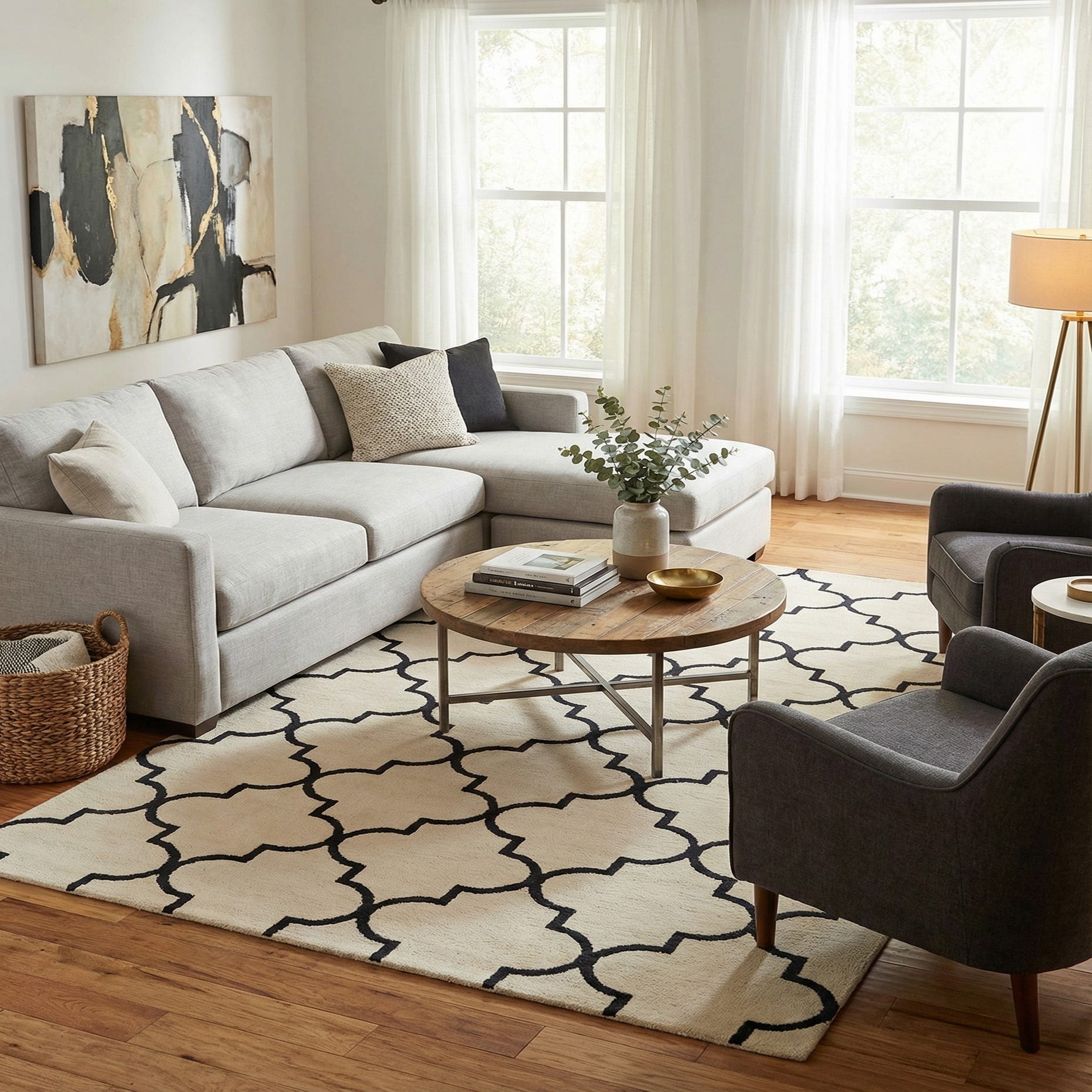 A 5x8 rectangular navy blue and beige modern area rug with a repeating quatrefoil pattern, suitable for a living room.