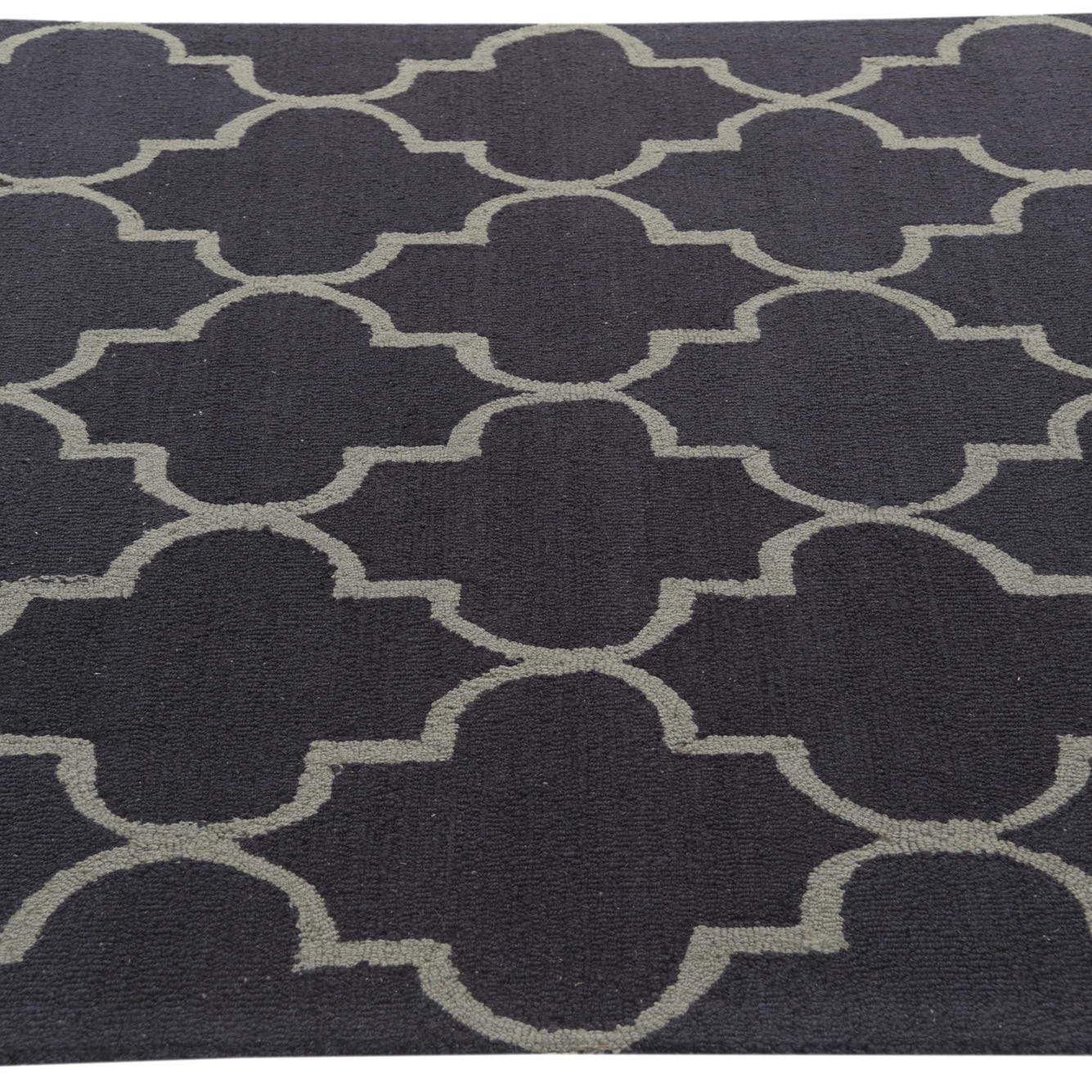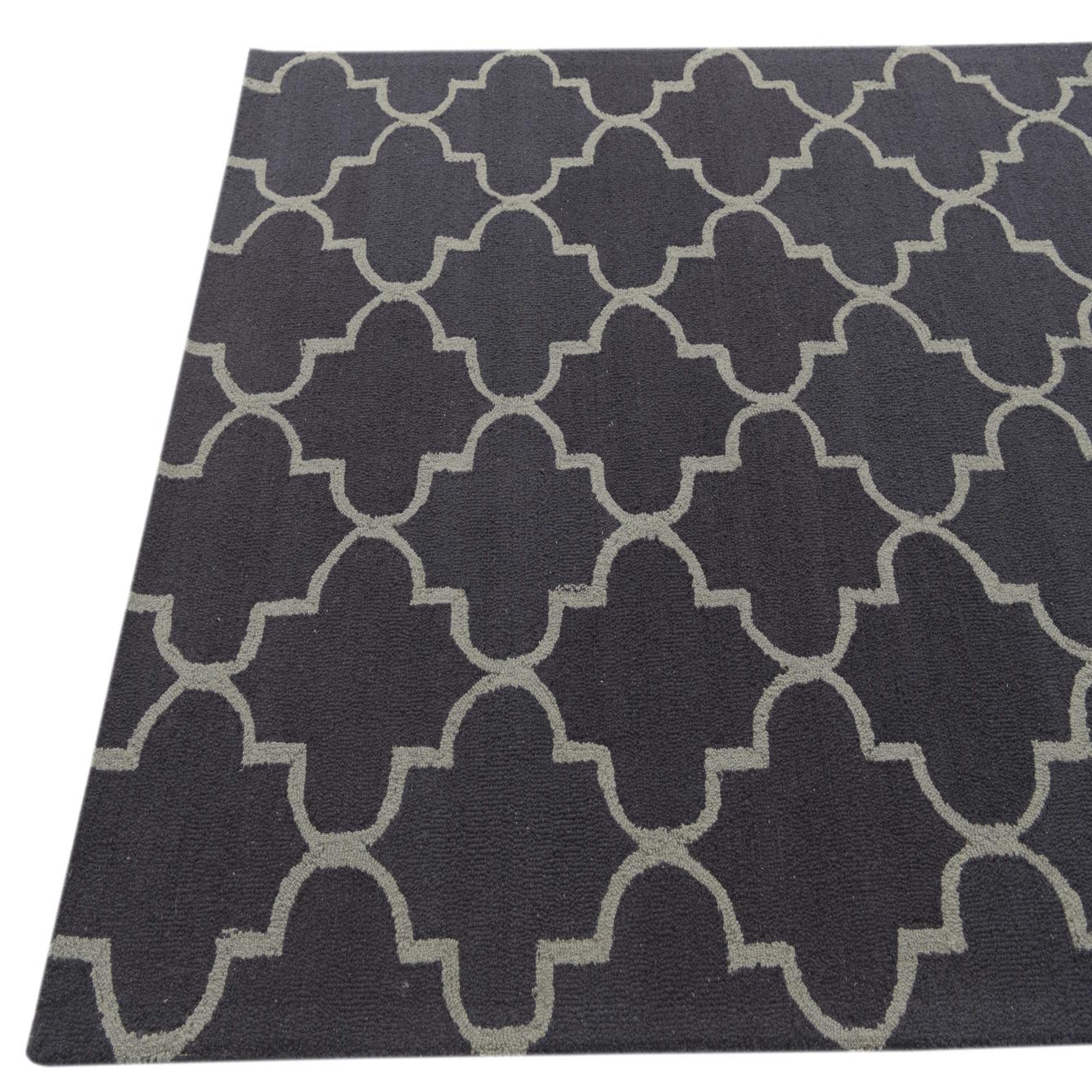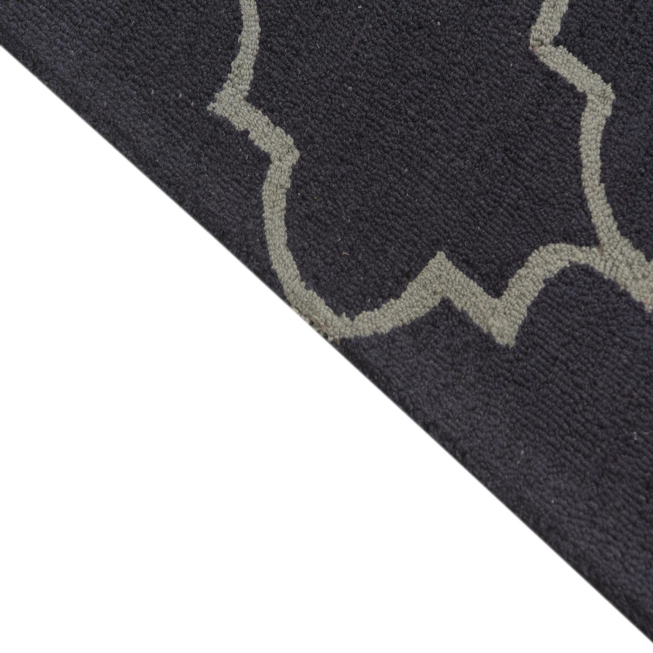 The Luna Collection 5x8 rug is hand-tufted from 100% wool, featuring a robust navy blue background accented with a graceful gray trellis pattern. The design is a modern twist on traditional Moroccan motifs, delivering a sophisticated geometric aesthetic. The hand-tufted wool construction ensures a dense, plush texture underfoot.