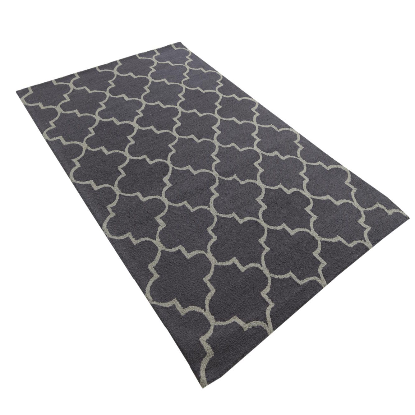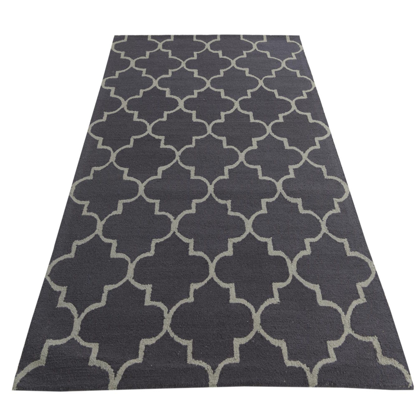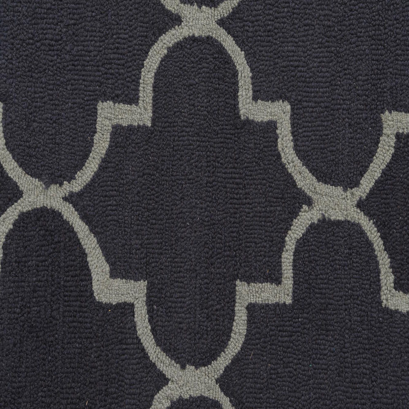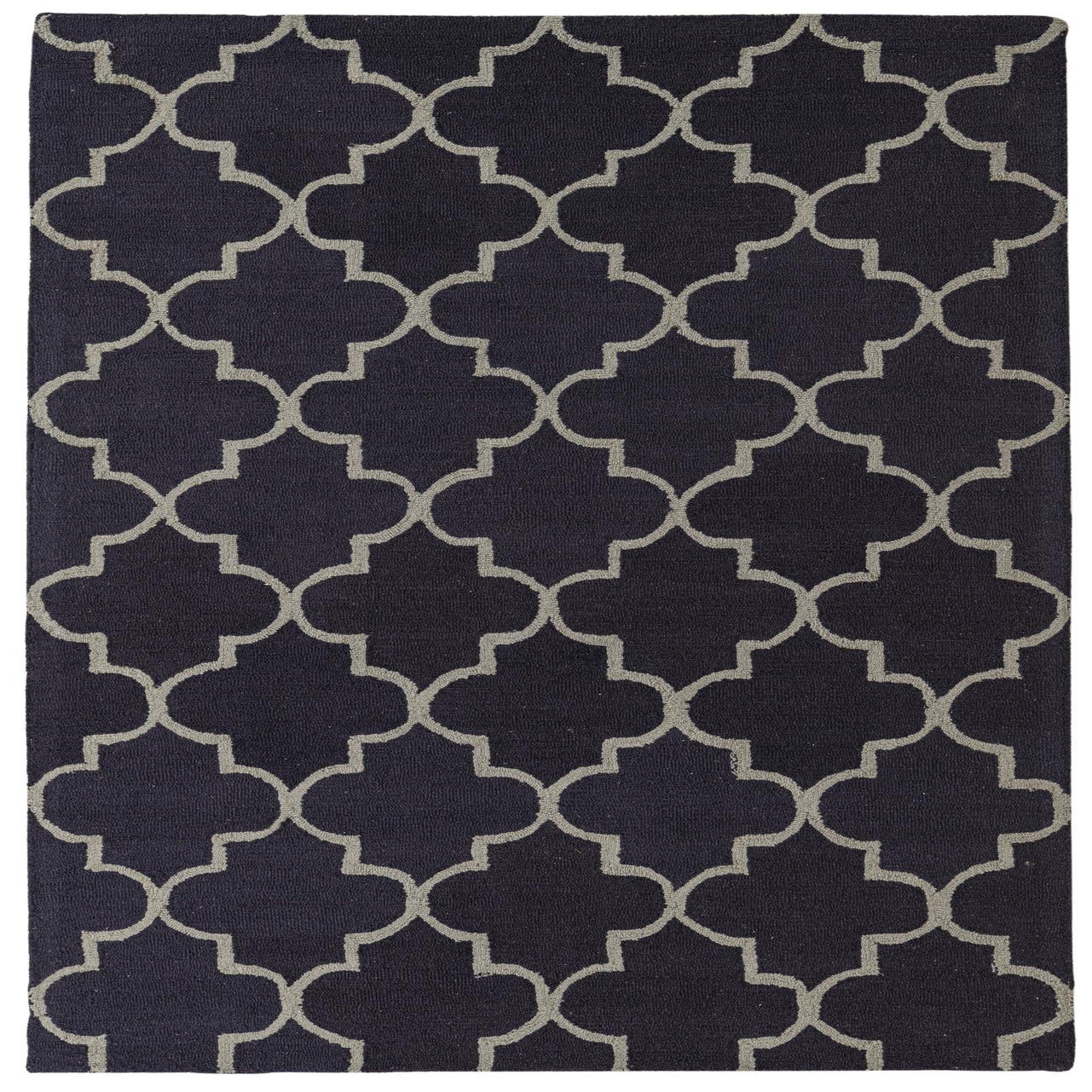 The Luna Collection 5x8 rug is hand-tufted from 100% wool, featuring a robust navy blue background accented with a graceful gray trellis pattern. The design is a modern twist on traditional Moroccan motifs, delivering a sophisticated geometric aesthetic. The hand-tufted wool construction ensures a dense, plush texture underfoot.