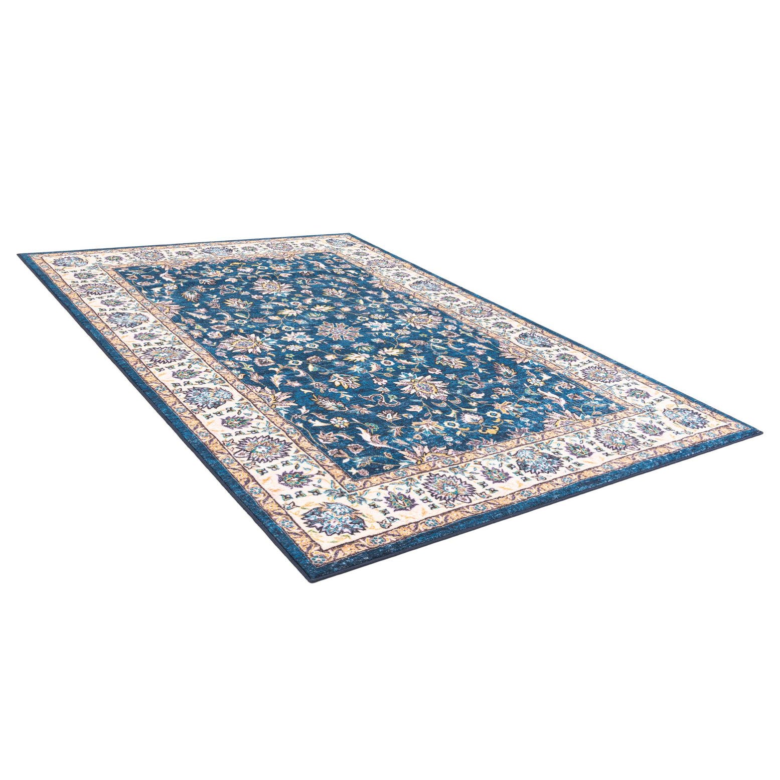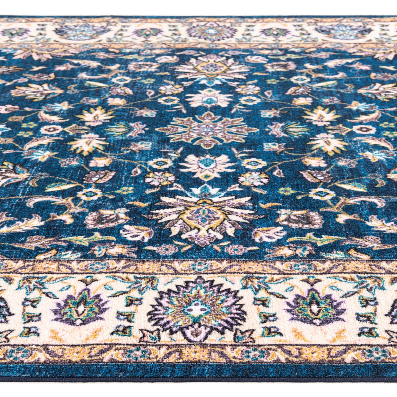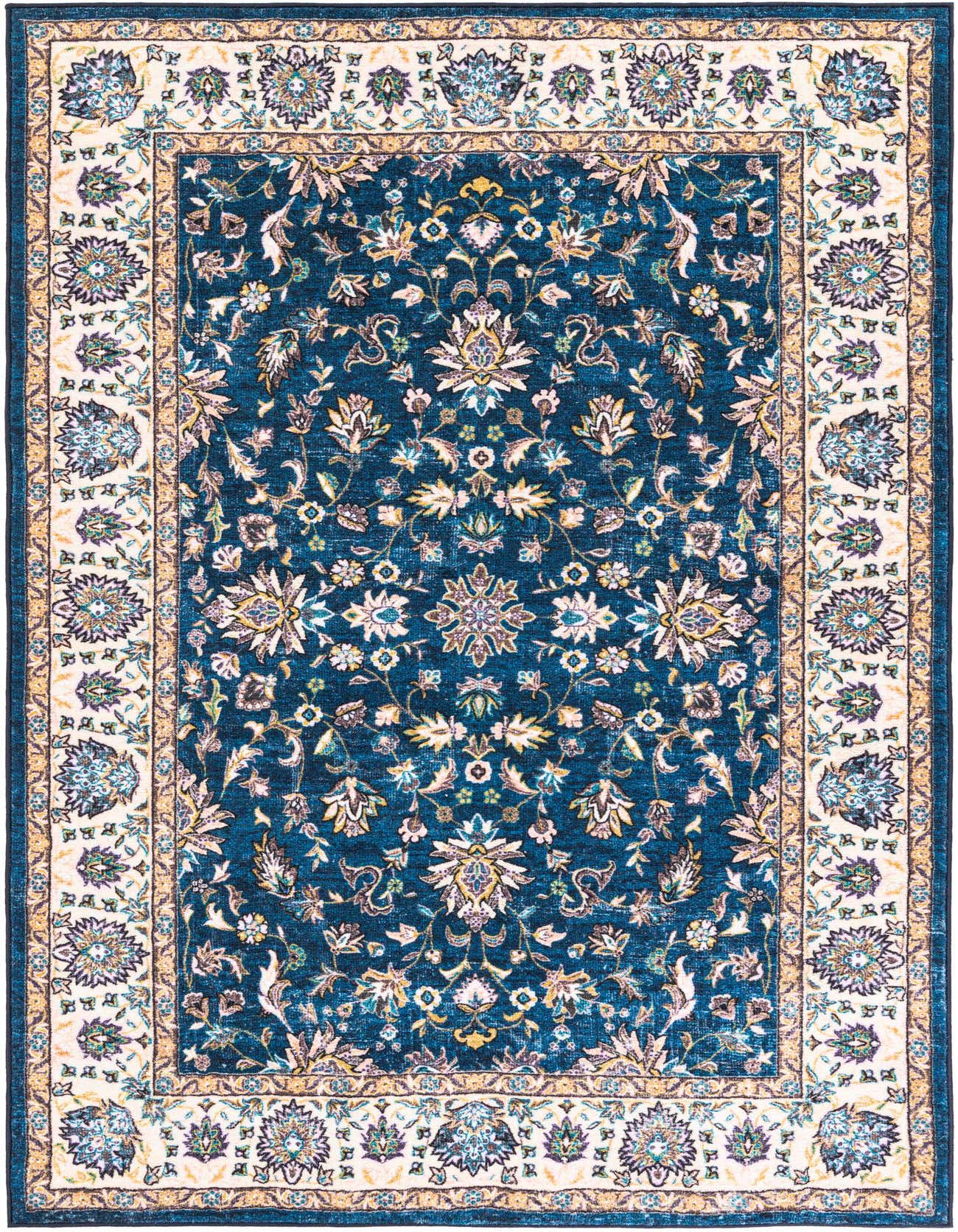 Primary color is Navy Blue. Colors in this rug include: Navy Blue, Beige, Black, Blue, Brown, Ivory, Yellow, Violet, Pink, Green, Burgundy.