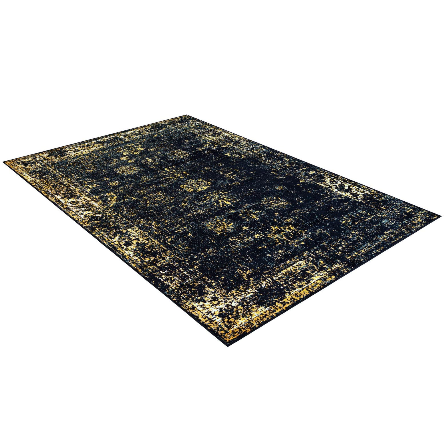 A 5x8 rectangular navy blue rug with distressed bohemian and traditional patterns in yellow and teal, ideal for a living room.