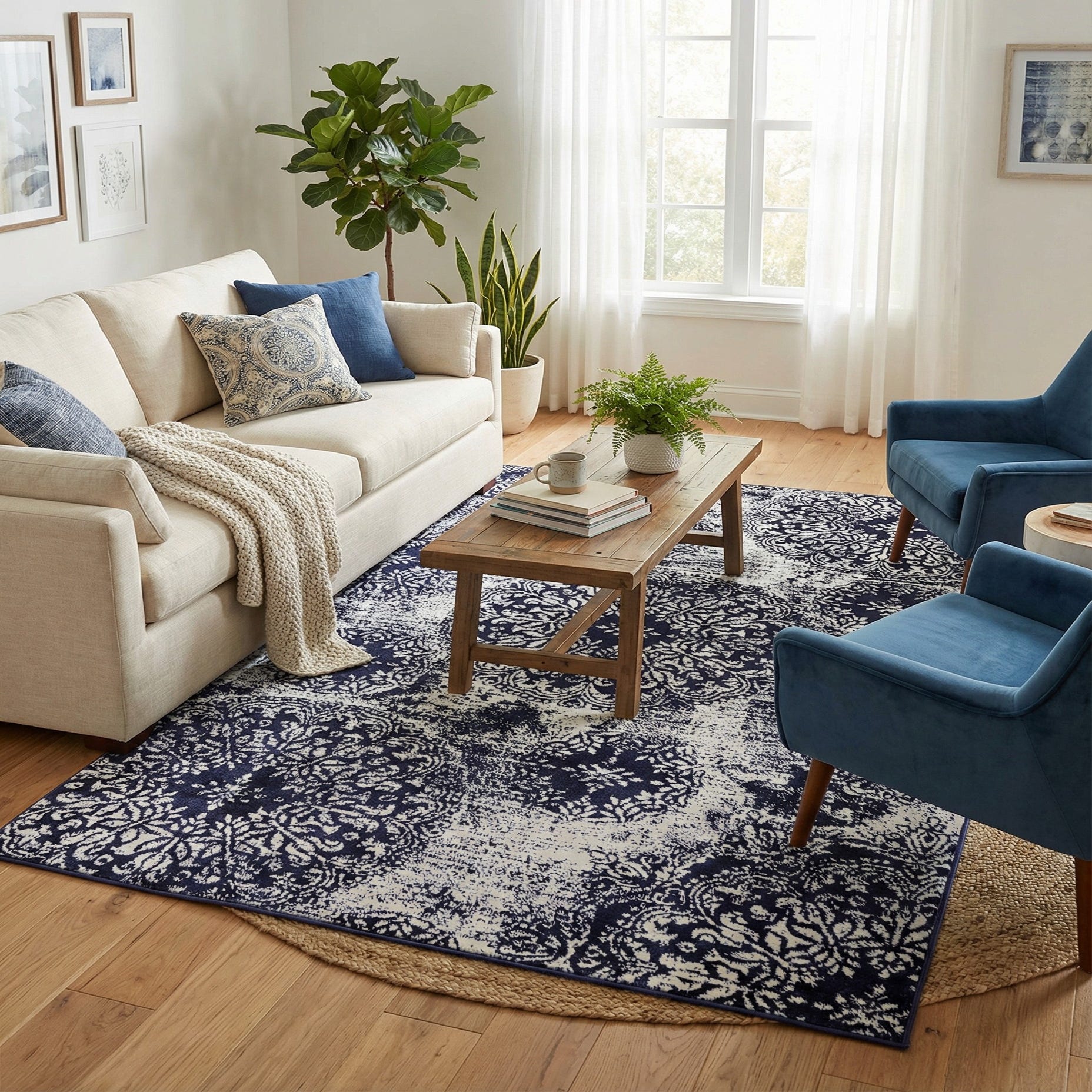 This rug showcases a detailed pattern reminiscent of traditional damask designs, creating a sense of timeless elegance. The dramatic contrast between navy and ivory offers visual depth and interest, making this rug a versatile addition to a variety of interior settings.