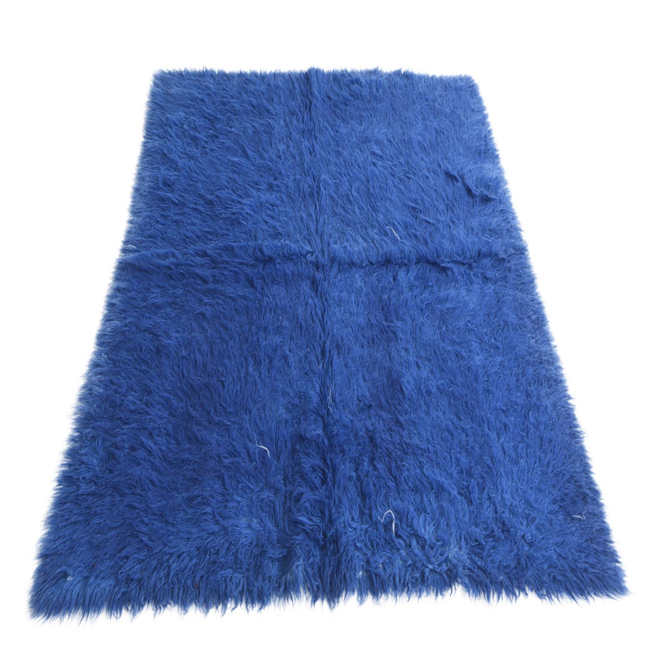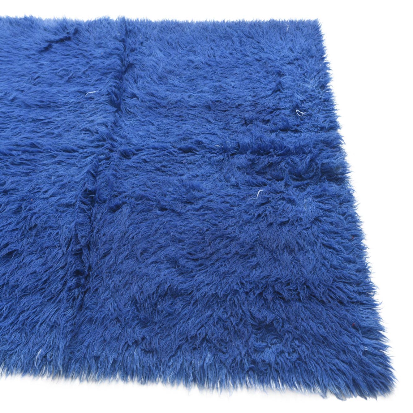 A plush 5x8 rectangular shag rug in a vibrant navy blue, featuring a soft, textured wool pile.