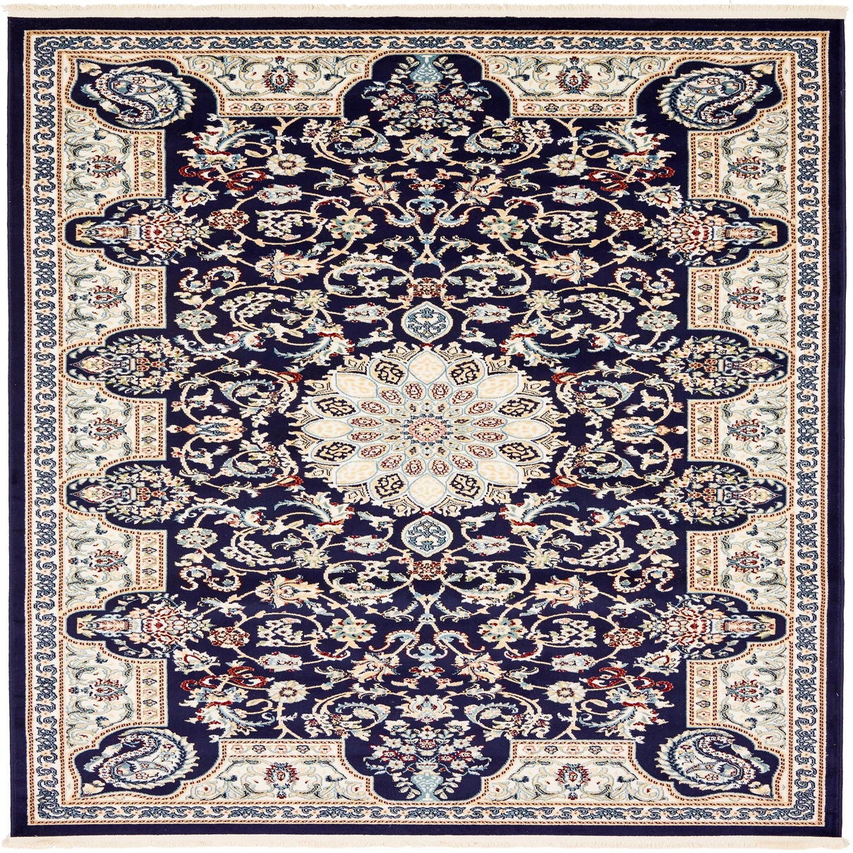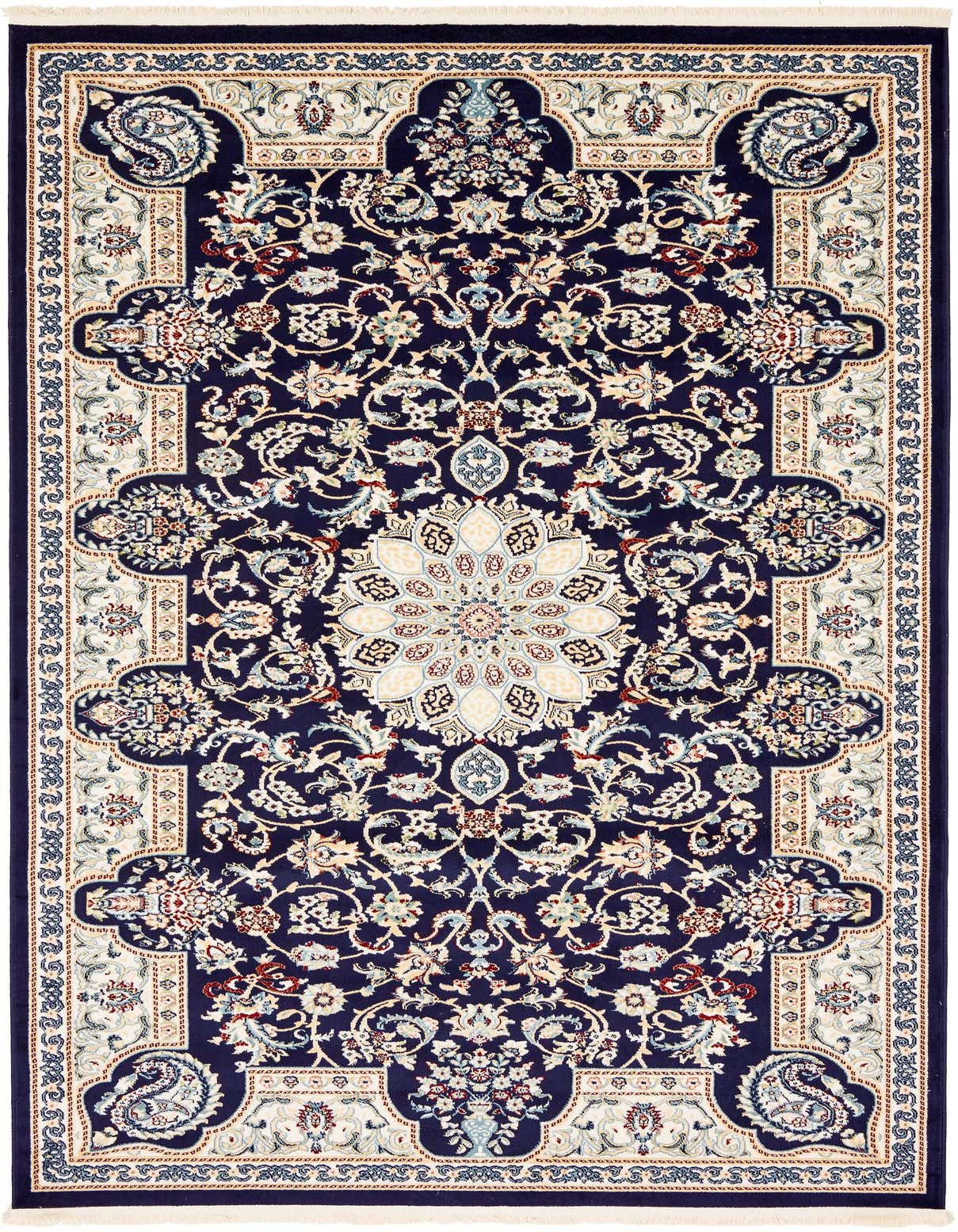 Primary color is Navy Blue. Colors in this rug include: Navy Blue, Beige, Blue, Burgundy, Cream, Green, Ivory, Puce.