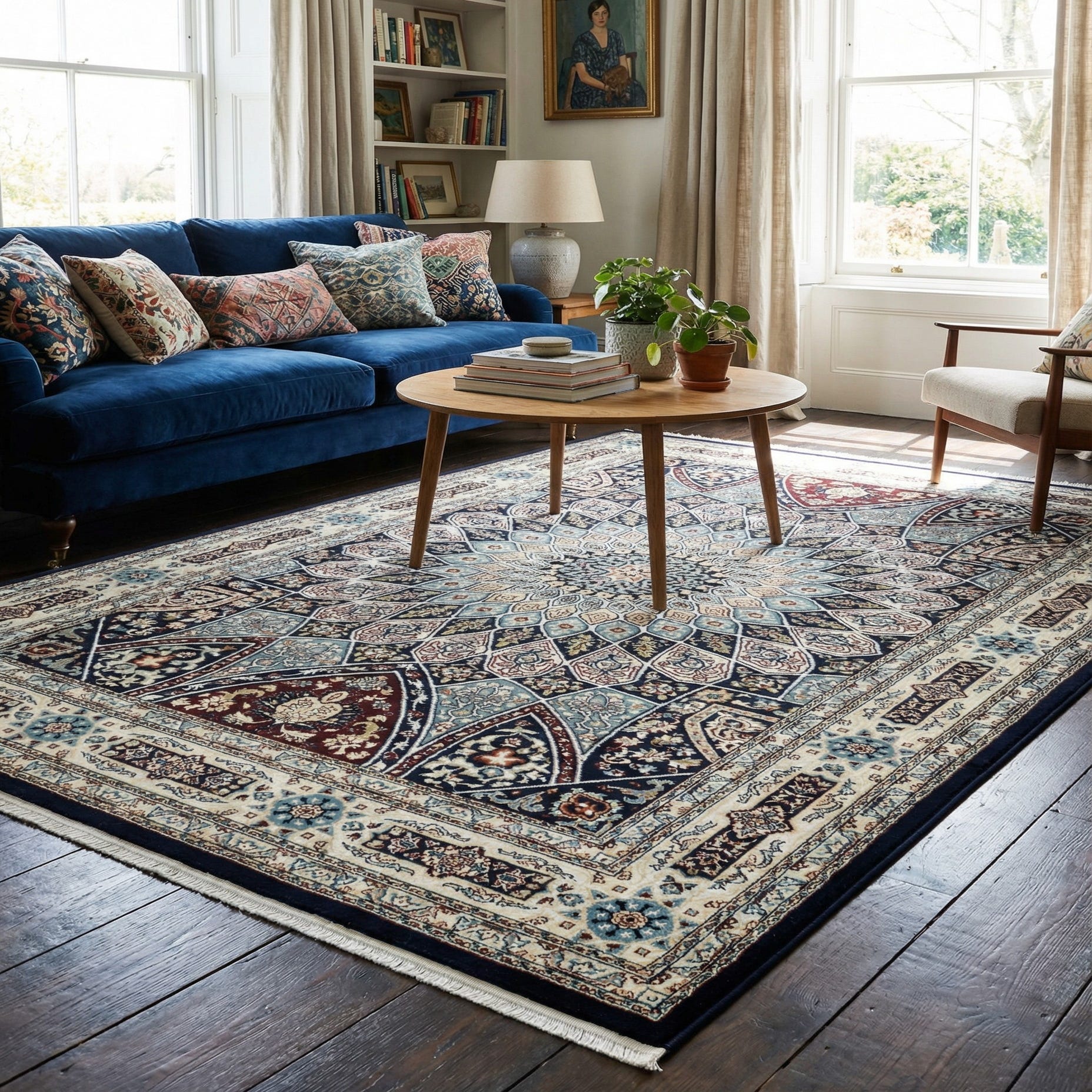 Machine-made from 85% polypropylene and 15% polyester, the rug has a low, tightly woven pile that feels smooth underfoot with a subtle, soft hand. Its construction holds the pattern sharply, so the intricate details remain clear in active spaces. This style works well beneath a living room coffee table or in a dining area to anchor furniture groups; it also suits a home office or entry where a traditional touch is desired. Pair it with medium to dark wood tones, neutral upholstery, or upholstered pieces in navy or cream to highlight the rug’s palette and bring cohesion to both classic and transitional interiors.