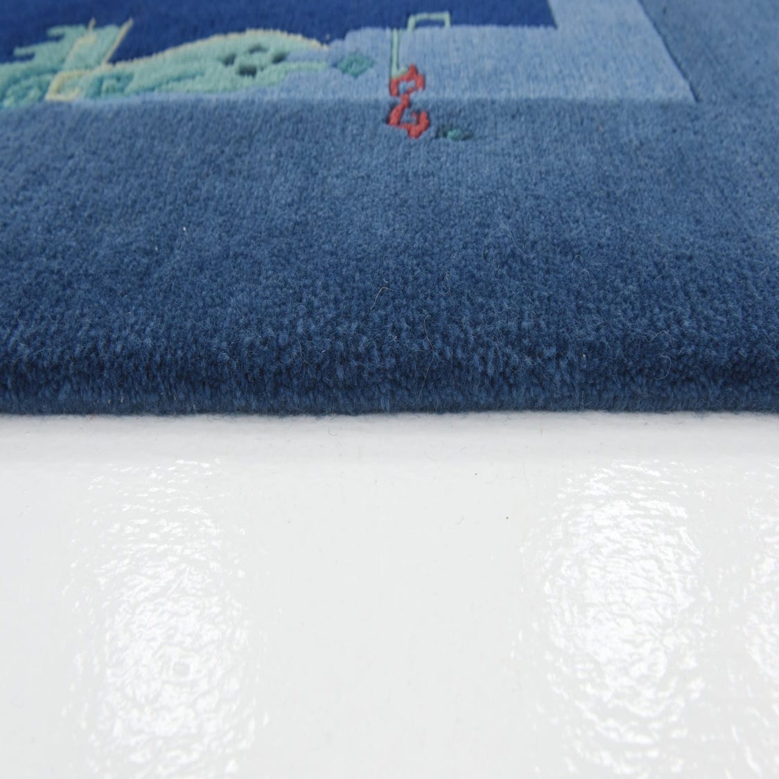 Primary color is Navy Blue. Colors in this rug include: Navy Blue, Blue, Light Blue, Peach, Red, Light Green.