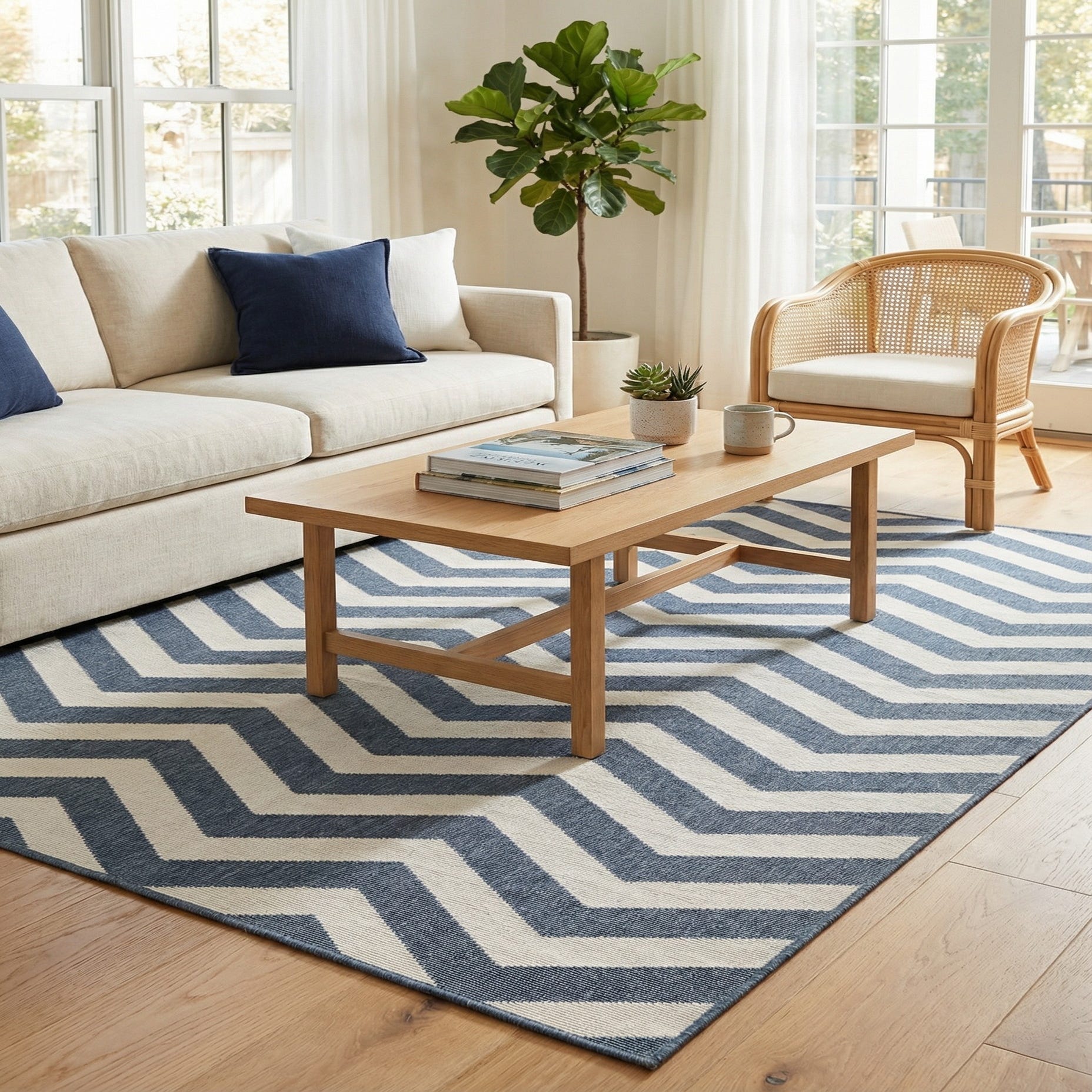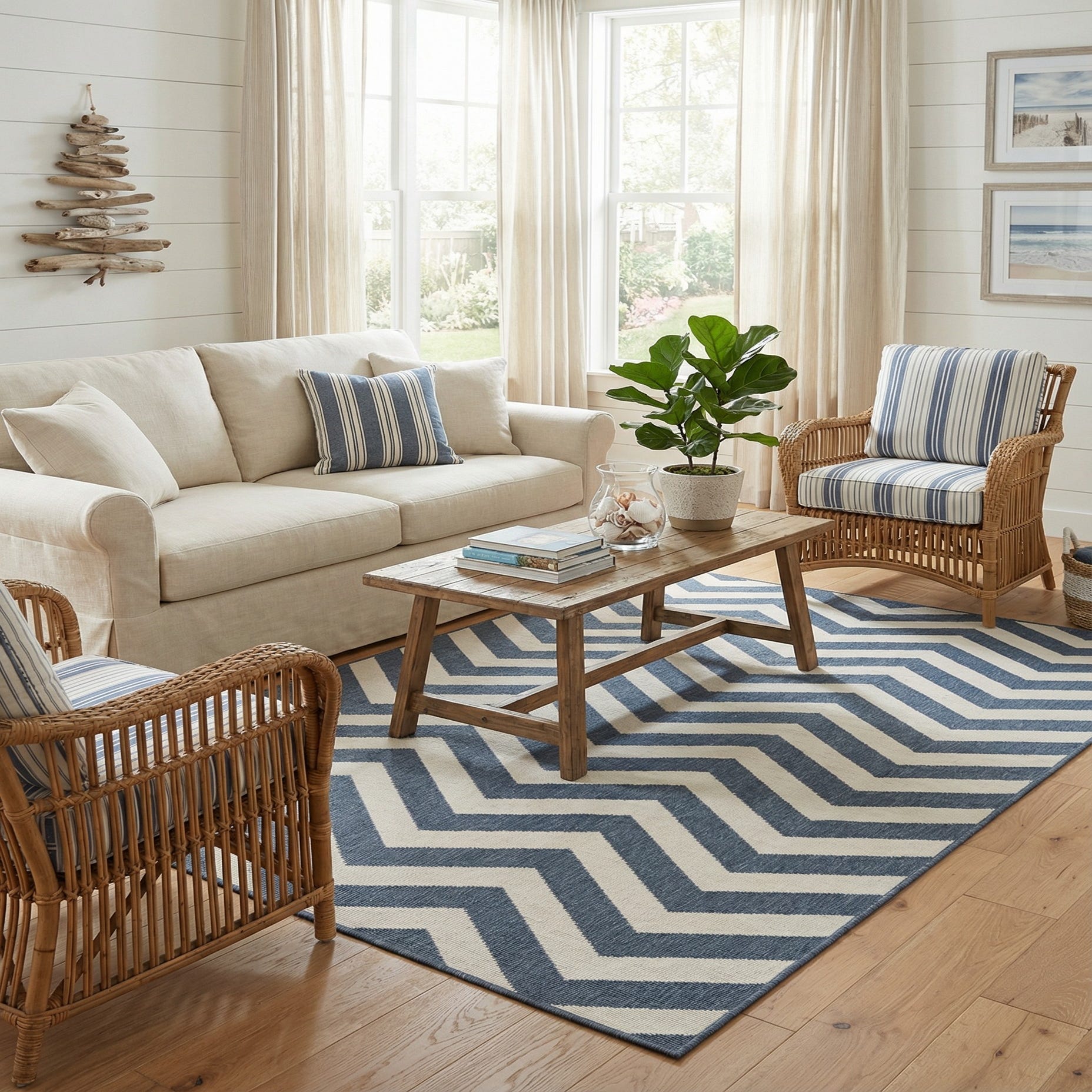 A crisp navy background sets the stage for a repeating ivory chevron that runs the length of the rug. The bold geometric stripes have a slightly heathered look in the navy bands, giving the pattern understated depth and a clean, modern coastal feel. The high-contrast layout reads fresh and structured, making it an easy anchor for rooms that favor simple lines and coastal-influenced color palettes.