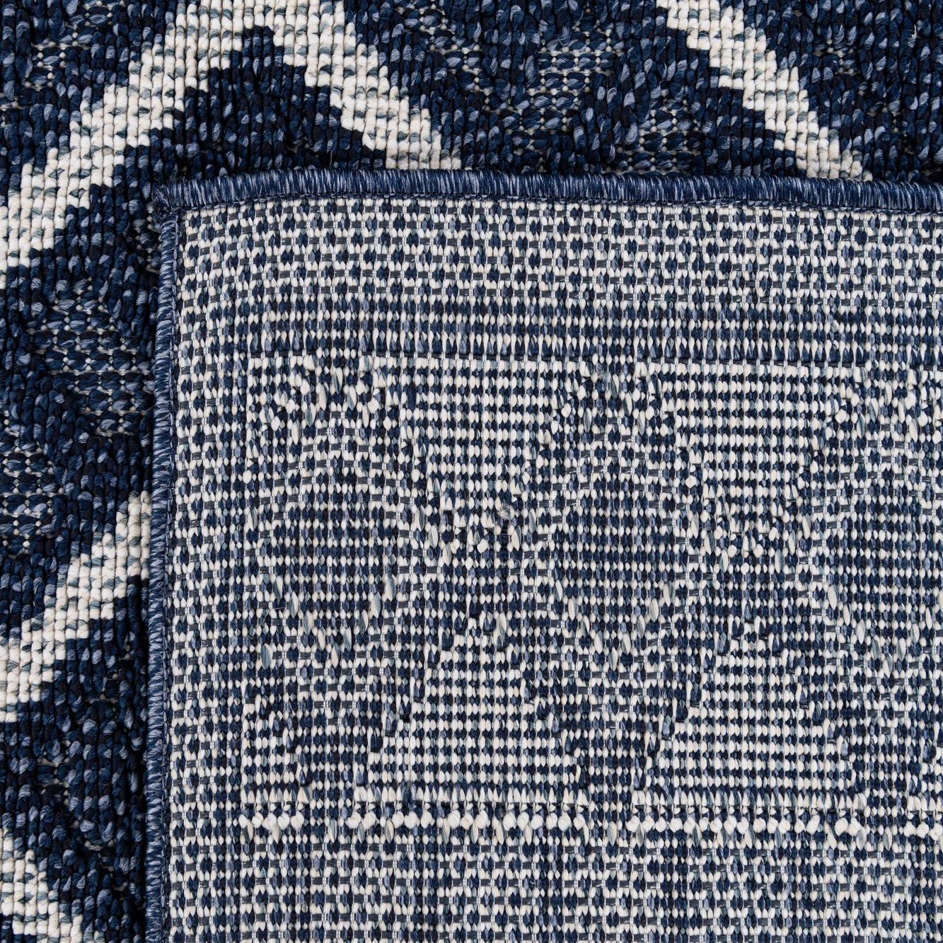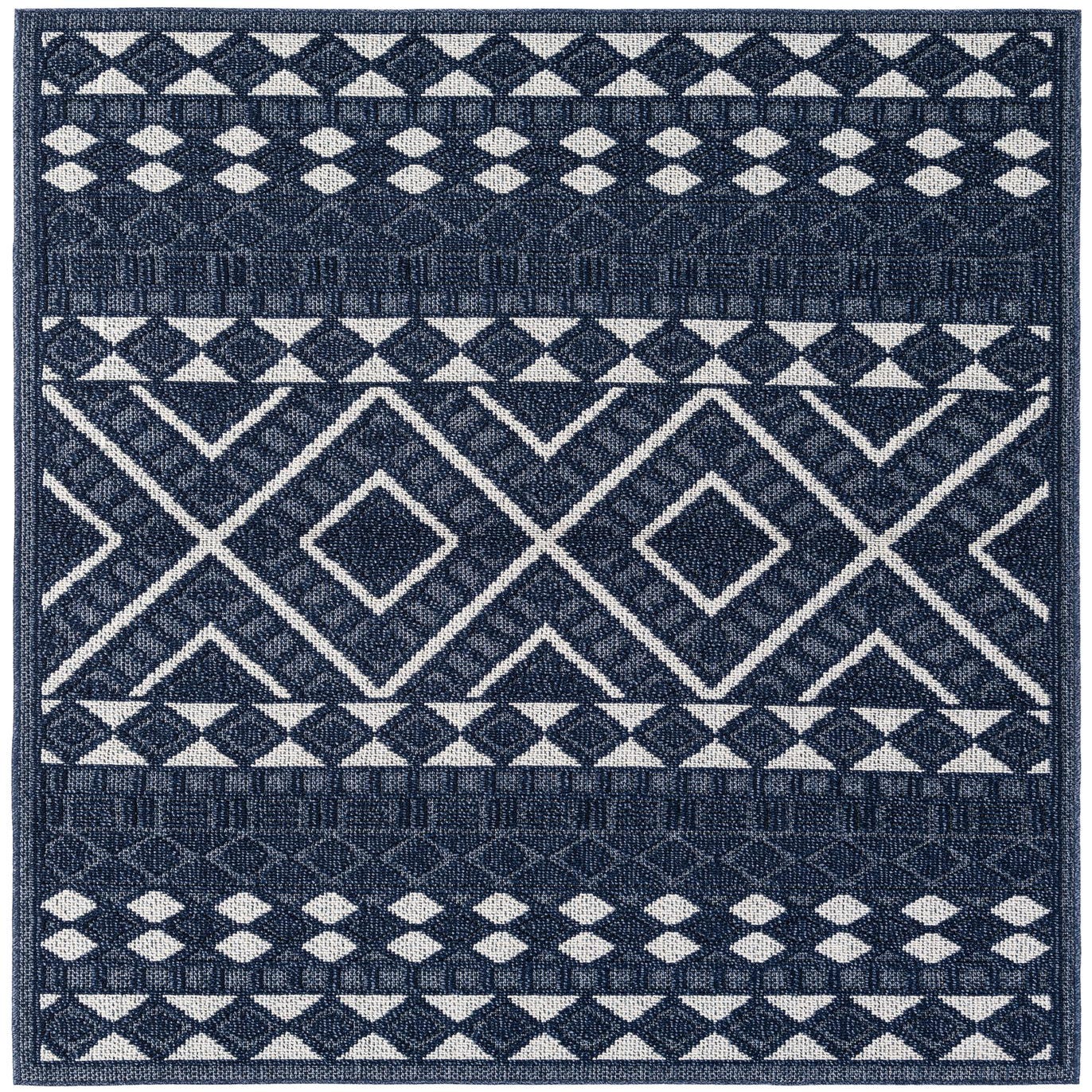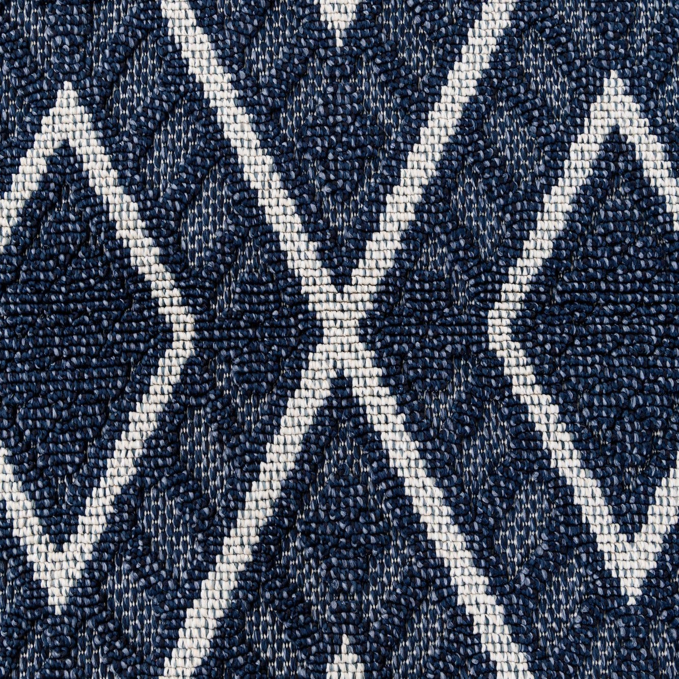 A 5x8 rectangular navy blue and white modern rug with a bold geometric diamond pattern, suitable for indoor/outdoor use.