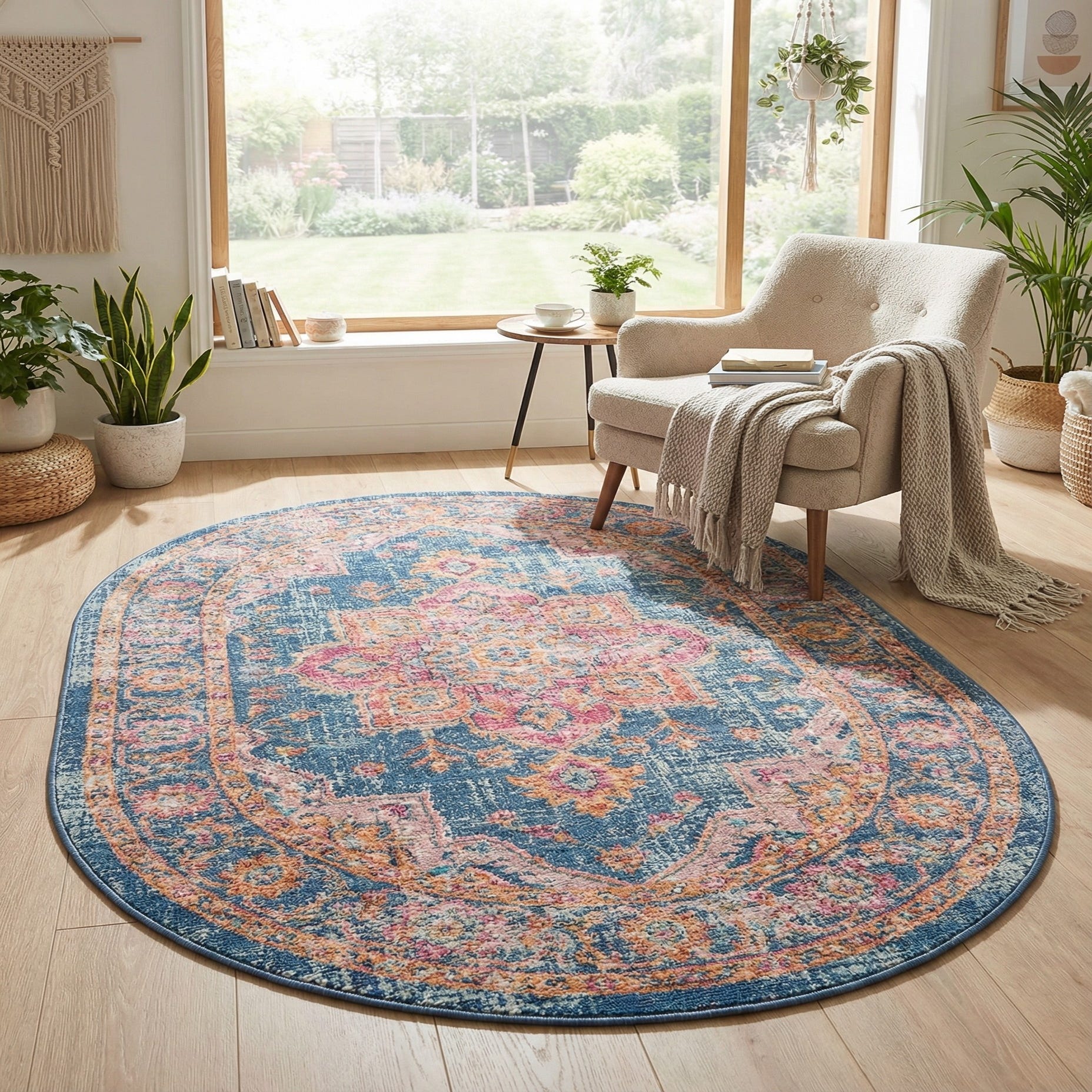 Machine-made from polyester chenille, the surface has a soft, velvety hand with a low, even pile that accentuates the color shifts and printed texture. Its oval shape makes it well suited to anchor a seating arrangement, tuck beneath a round dining table, or add warmth to a bedroom reading nook. Pair it with warm wood tones and neutral upholstery to let the navy and rust accents stand out, or coordinate with slate-gray furnishings and orange or blue throw pillows for a more layered, contemporary look.