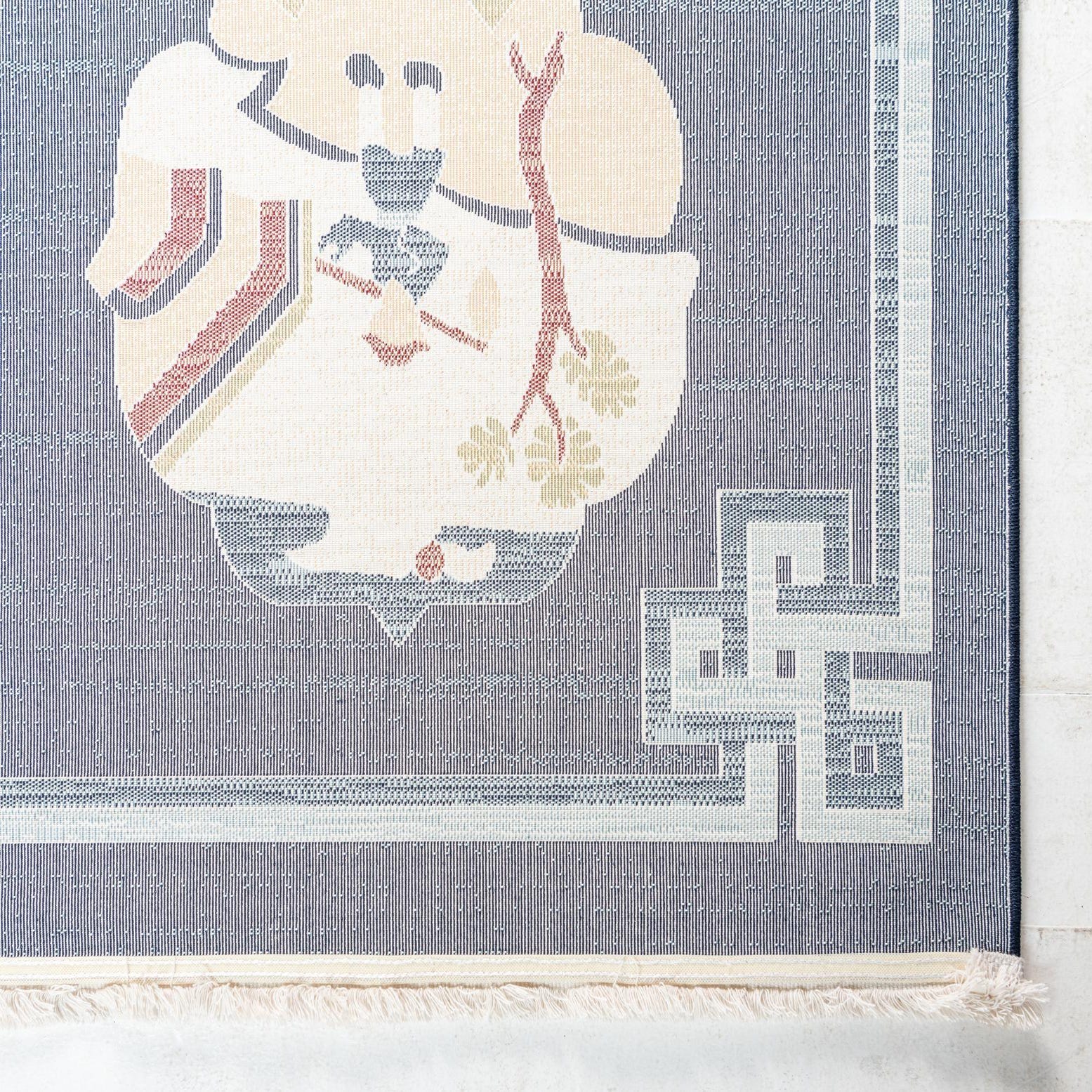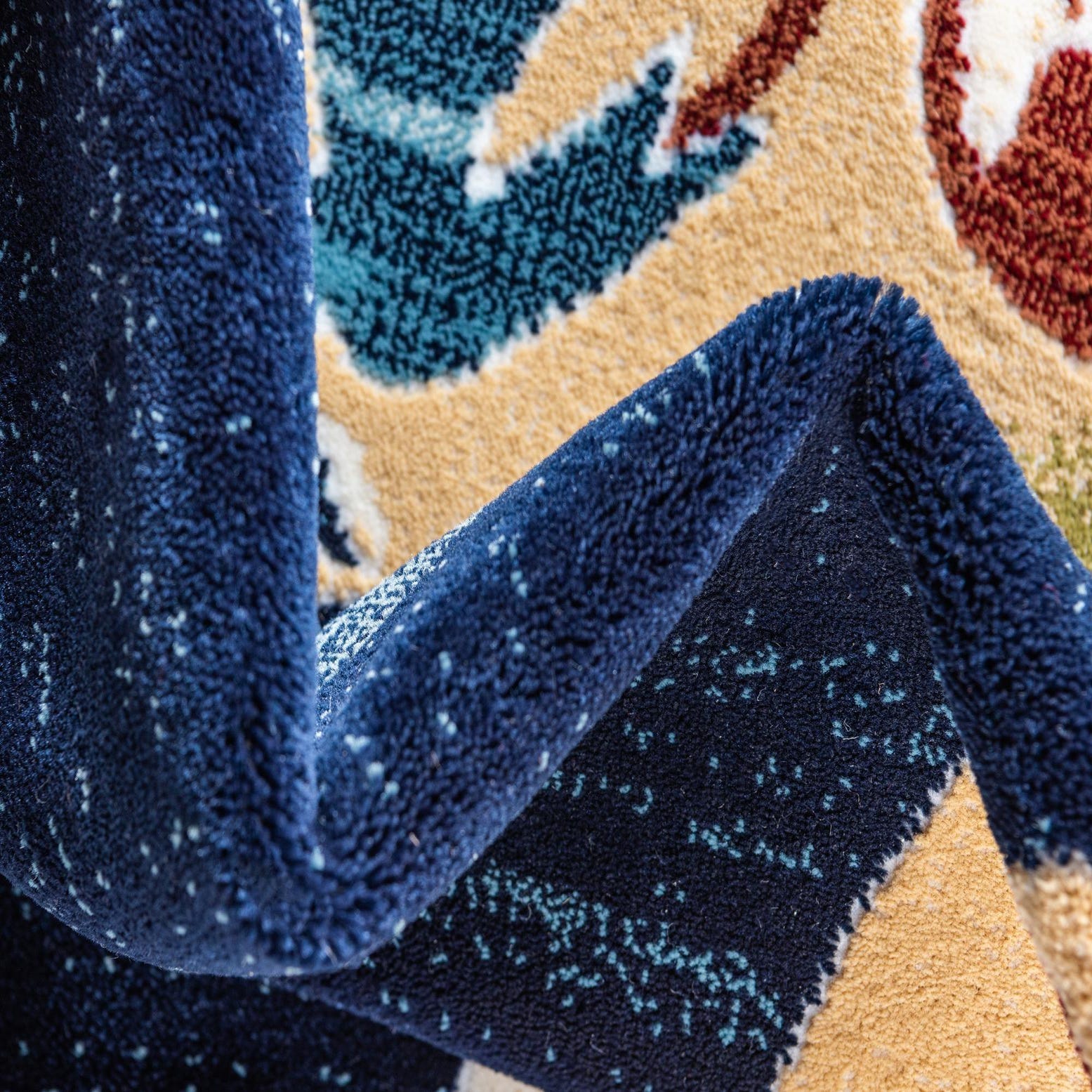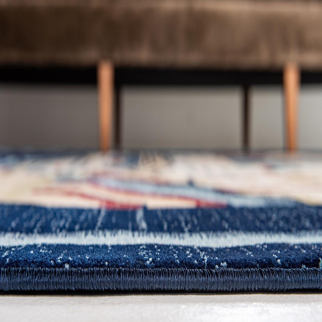 Primary color is Navy Blue. Colors in this rug include: Navy Blue, Burgundy, Cream, Green, Ivory, Light Blue.