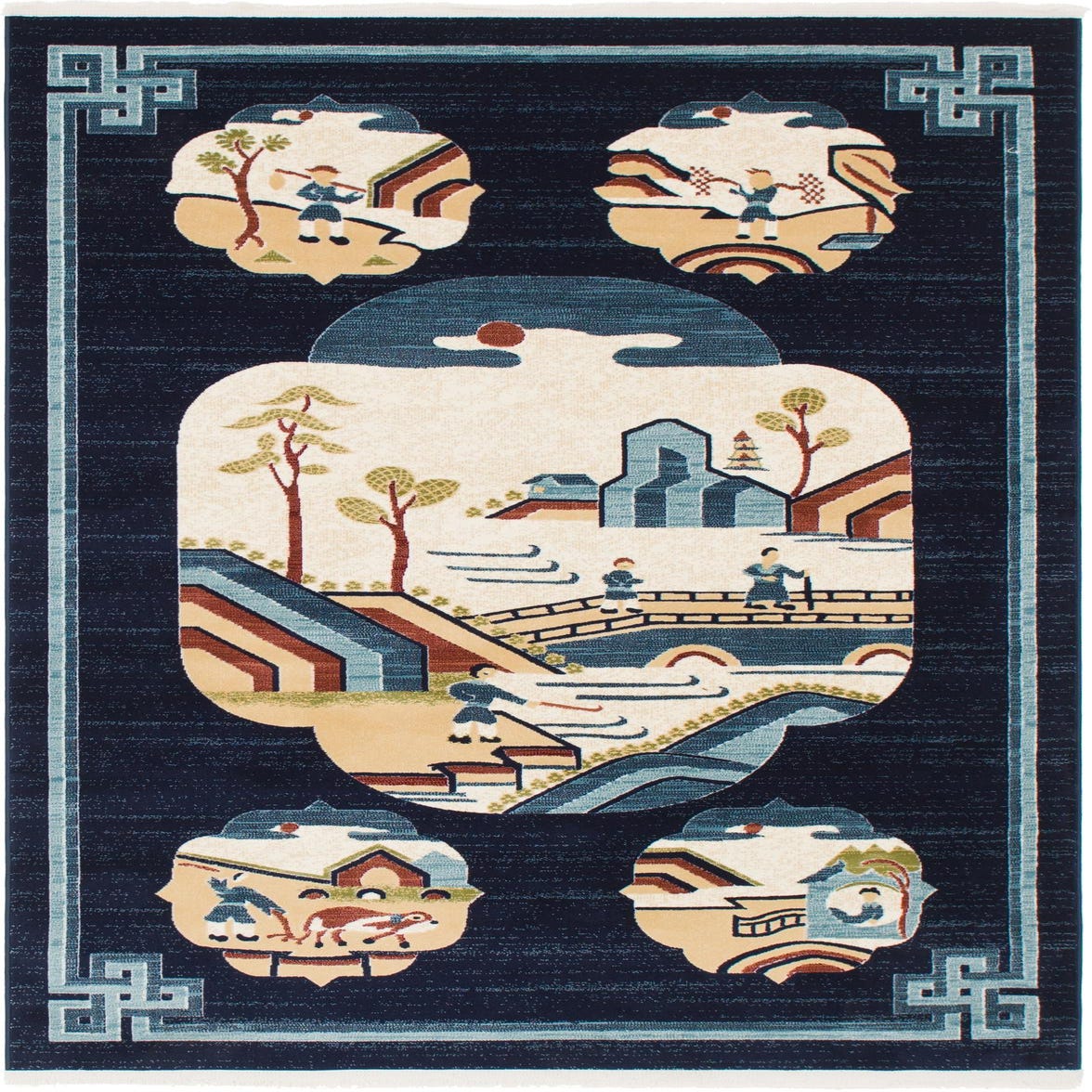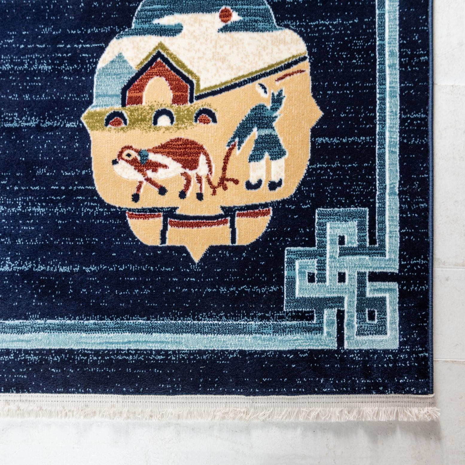 Primary color is Navy Blue. Colors in this rug include: Navy Blue, Burgundy, Cream, Green, Ivory, Light Blue.