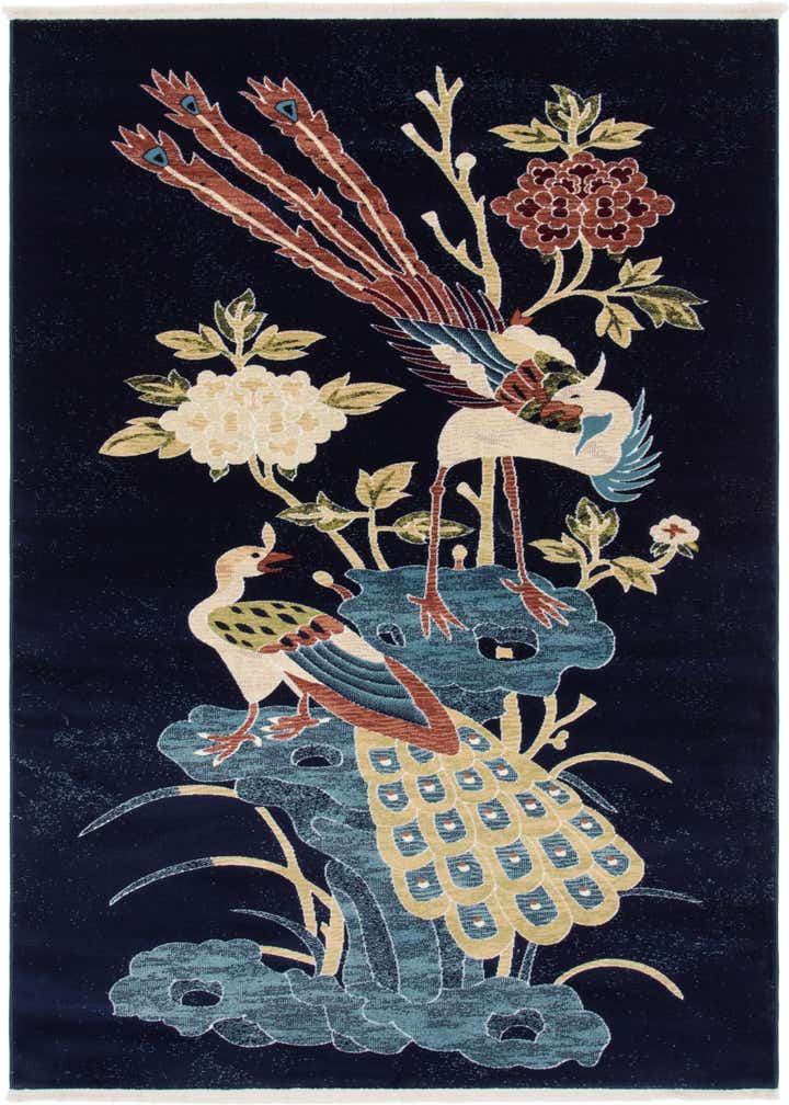 Primary color is Navy Blue. Colors in this rug include: Navy Blue, Blue, Tan, Pink, Red, Olive, Burgundy, Ivory.