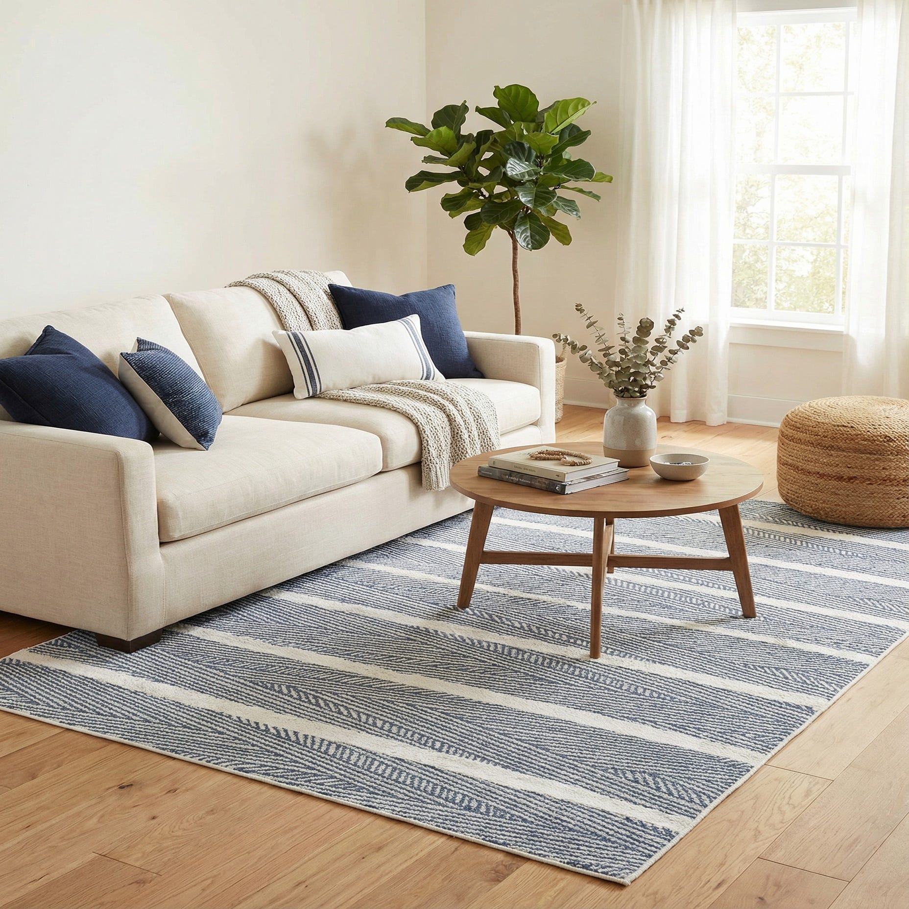 Its flatweave construction offers a smooth texture and a tightly woven surface, making it an ideal choice for high-traffic areas. Given the rug's clean lines and contemporary pattern, it would effortlessly complement modern, coastal, or minimalist decor. The navy blue and ivory color scheme allows for easy pairing with various interior palettes, making it a versatile choice for a living room, dining space, or bedroom. Moreover, the rug's shed-free property ensures longevity and ease of maintenance, ensuring that it remains an integral part of any interior for years to come.