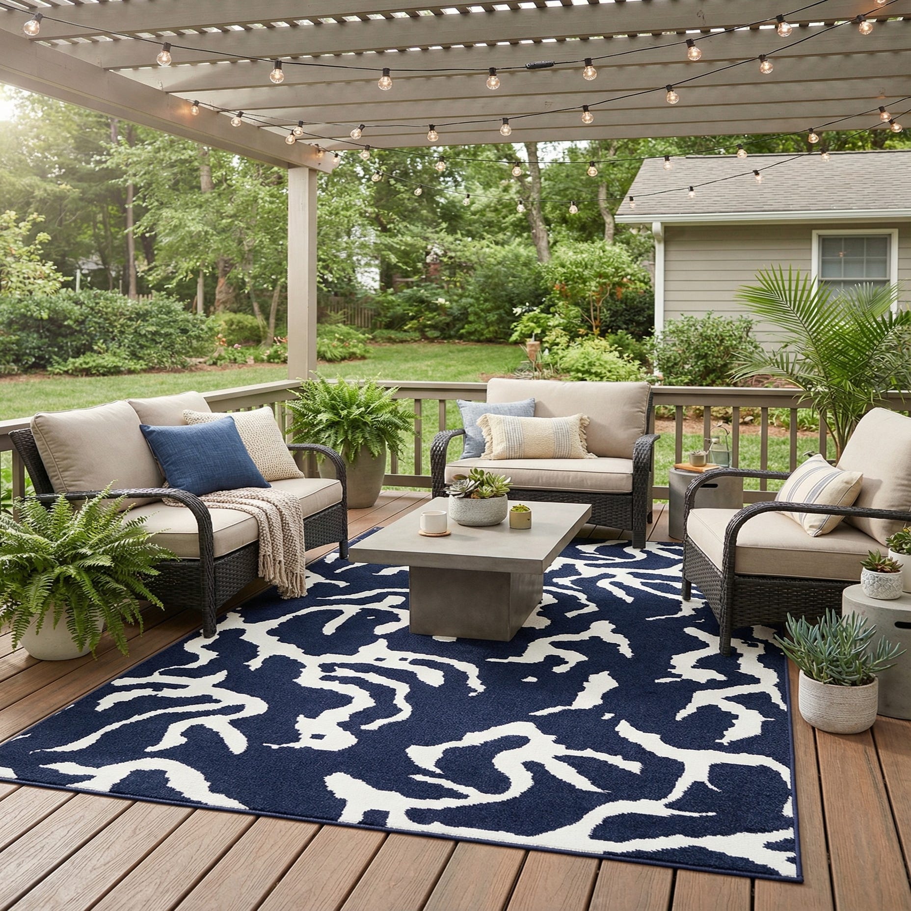 A 5x8 rectangular navy blue and white modern area rug with an abstract, organic pattern, suitable for indoor or outdoor use.