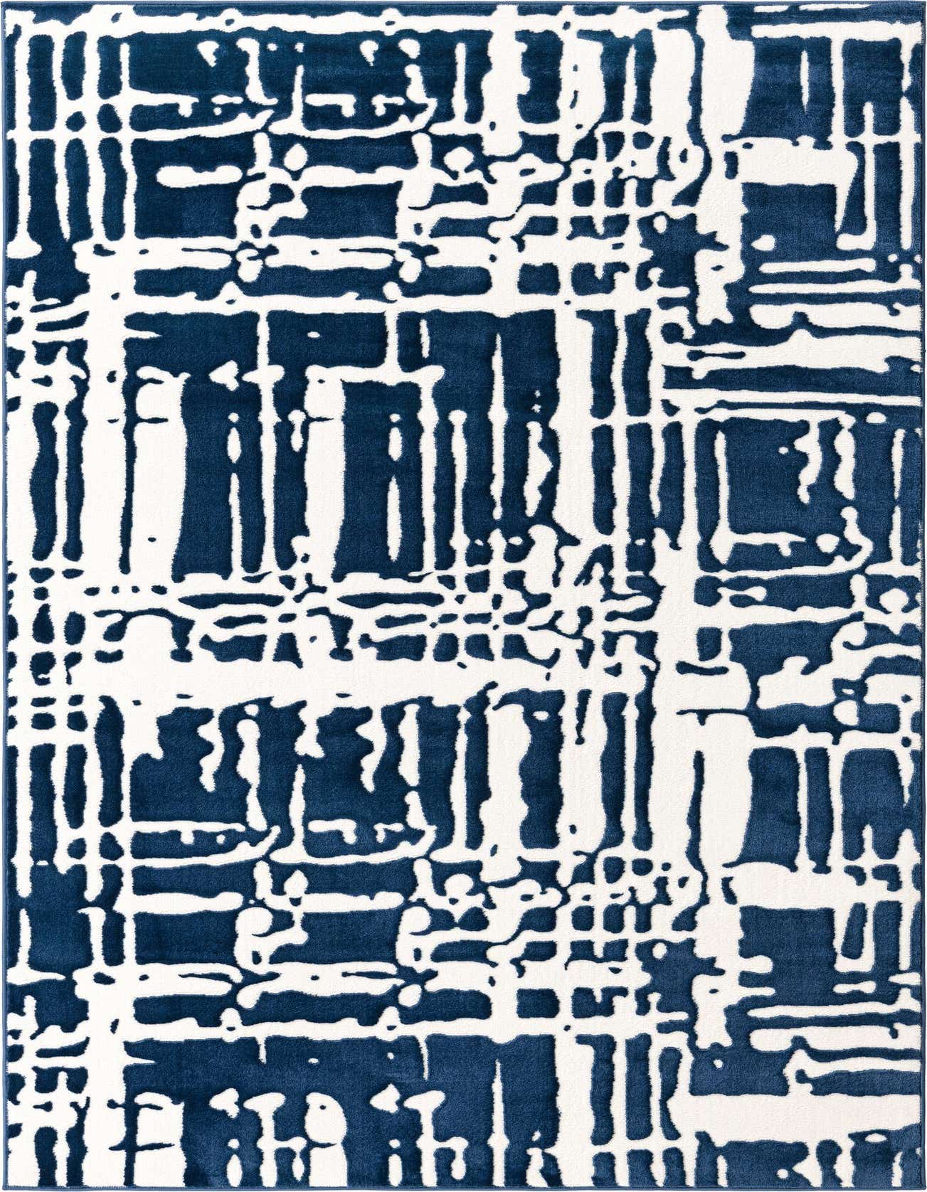 For interior design applications, this piece works harmoniously with contemporary and modern decor, providing a statement piece that can anchor a room's aesthetic. The contrast of navy blue and ivory can complement a range of color schemes, from neutral tones to more vibrant palettes. Pairing this rug with sleek furniture and metallic accents will accentuate its modern vibe, while placing it within a coastal-inspired theme can highlight its more subtle, organic qualities.