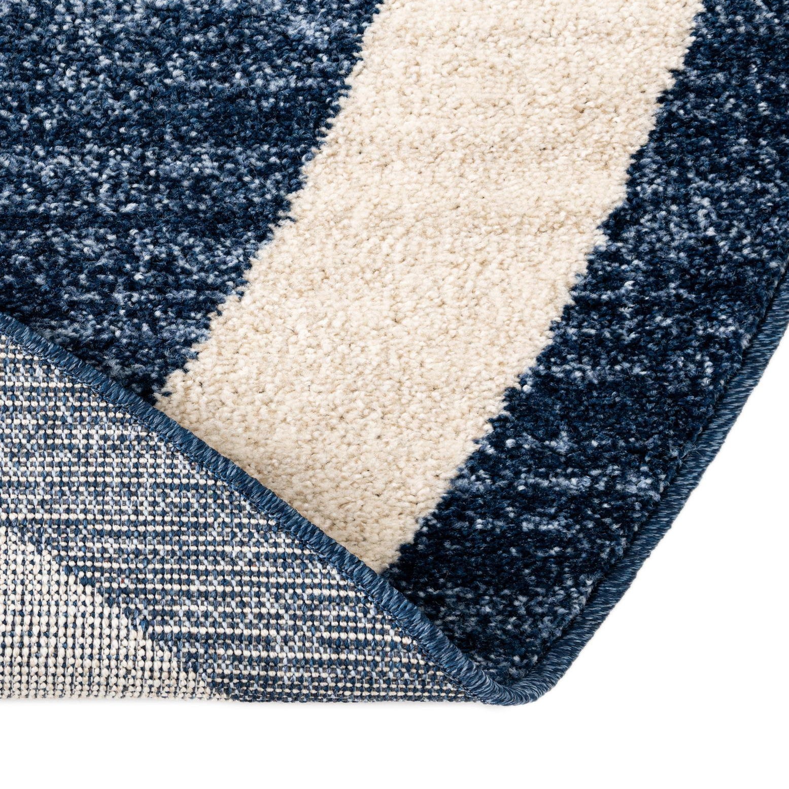 Works beautifully to anchor a round dining table, define a small conversation area, or sit beneath a bedroom seating nook. The navy-and-ivory palette pairs easily with light or dark woods, white trim, and brushed metal accents, making it a good fit for contemporary, coastal, or transitional interiors. The simple geometric border offers structure for minimalist schemes while the textured surface brings a subtle layer of warmth.