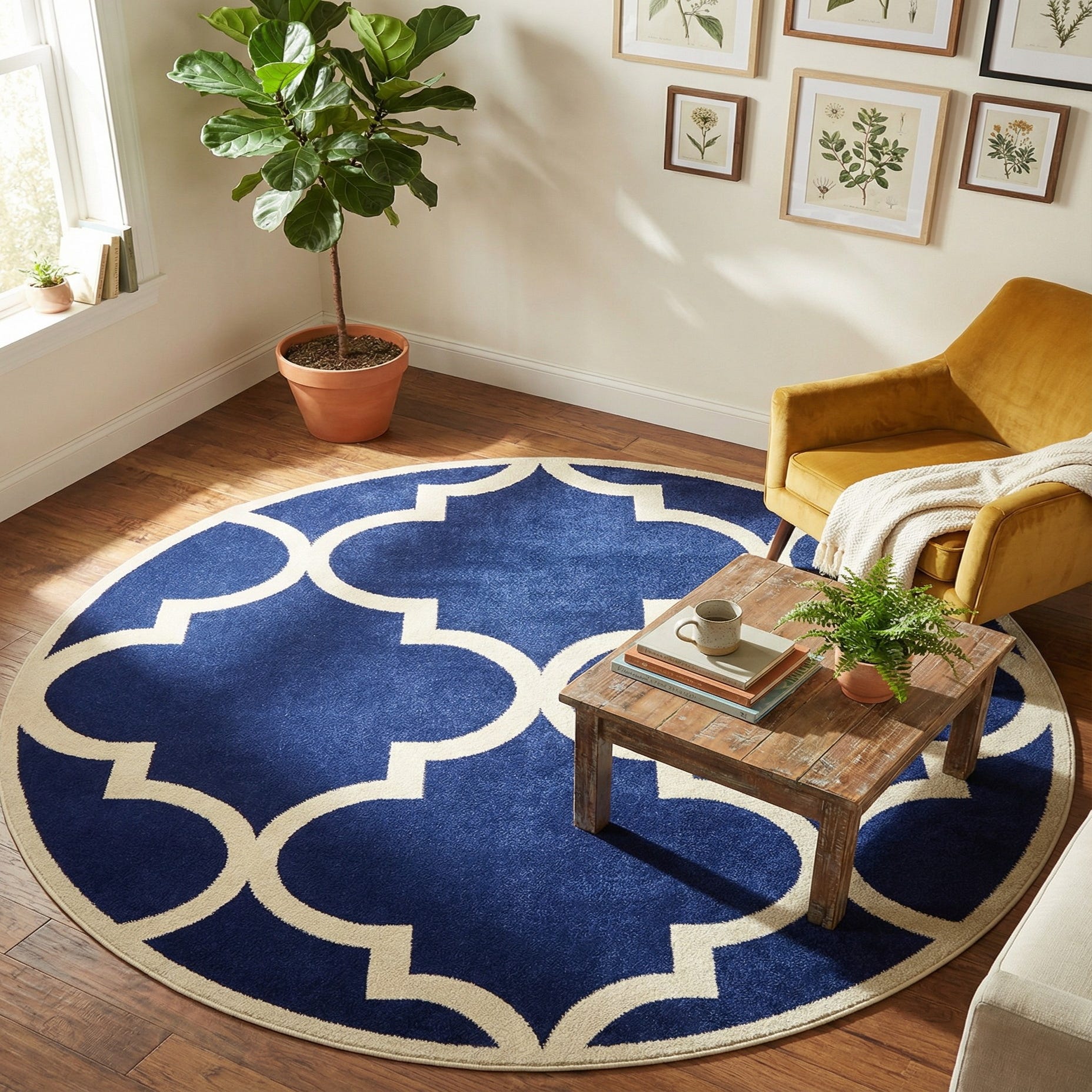 This round design works especially well under a small dining table, centered in a compact living room seating area, or layered at the foot of a bed to add visual anchor and contrast. Pair it with light wood tones and brass or matte black accents for a modern-traditional look, or with crisp white trim and navy upholstery for a coastal-inspired scheme. Solid textiles will let the pattern stand out, while subtle geometric pillows can echo the motif for a cohesive, pulled-together feel.