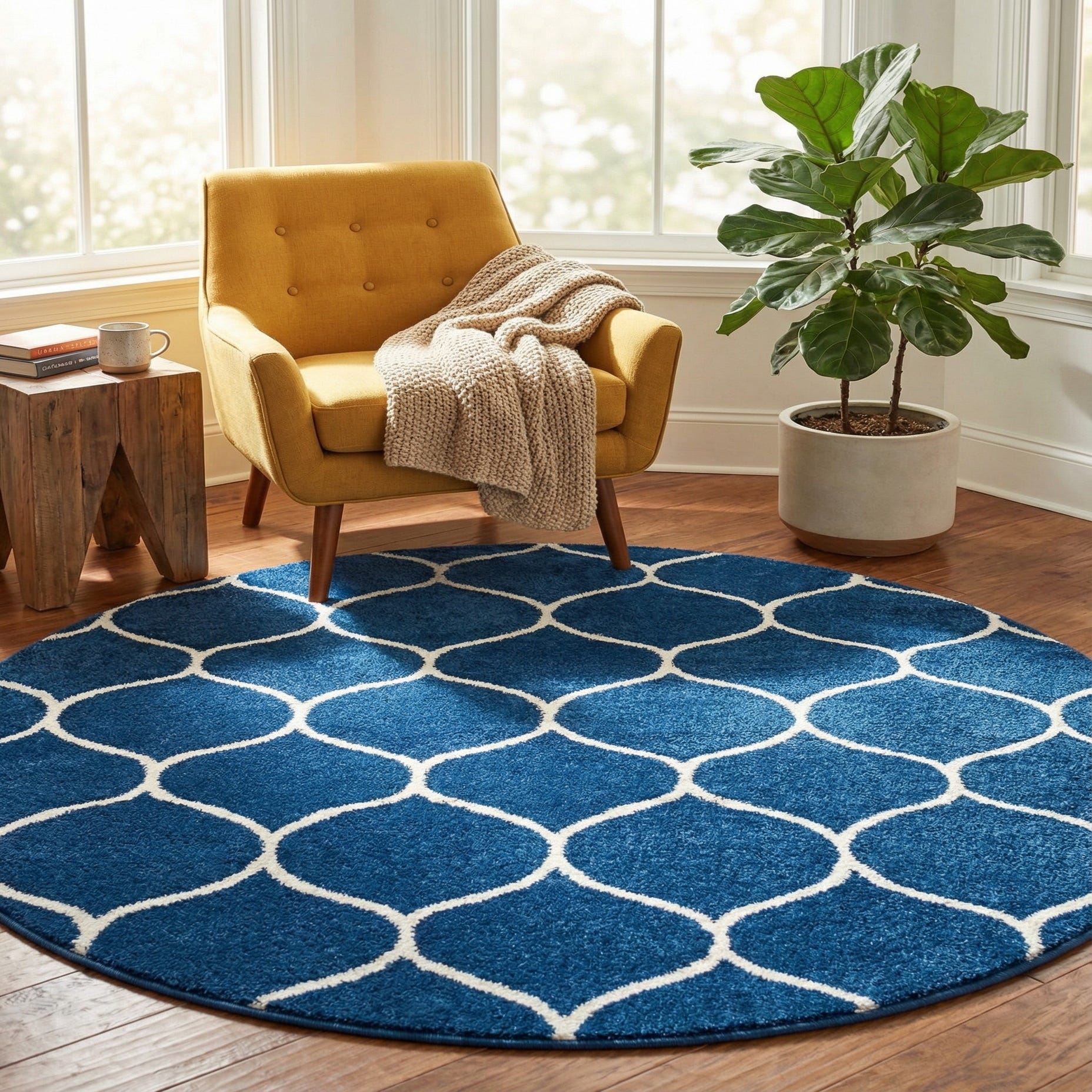 A deep navy field sets a bold, grounding stage for a clean ivory lattice that traces an ogee-inspired trellis across the surface. The repeating geometric pattern has a balanced, rhythmic presence, while the ivory lines sit slightly raised against the rich blue, giving the rug subtle dimensionality. Machine-made of 100% polypropylene, the cut-pile surface is dense and soft underfoot with a low-sheen finish that catches light without overpowering the pattern.