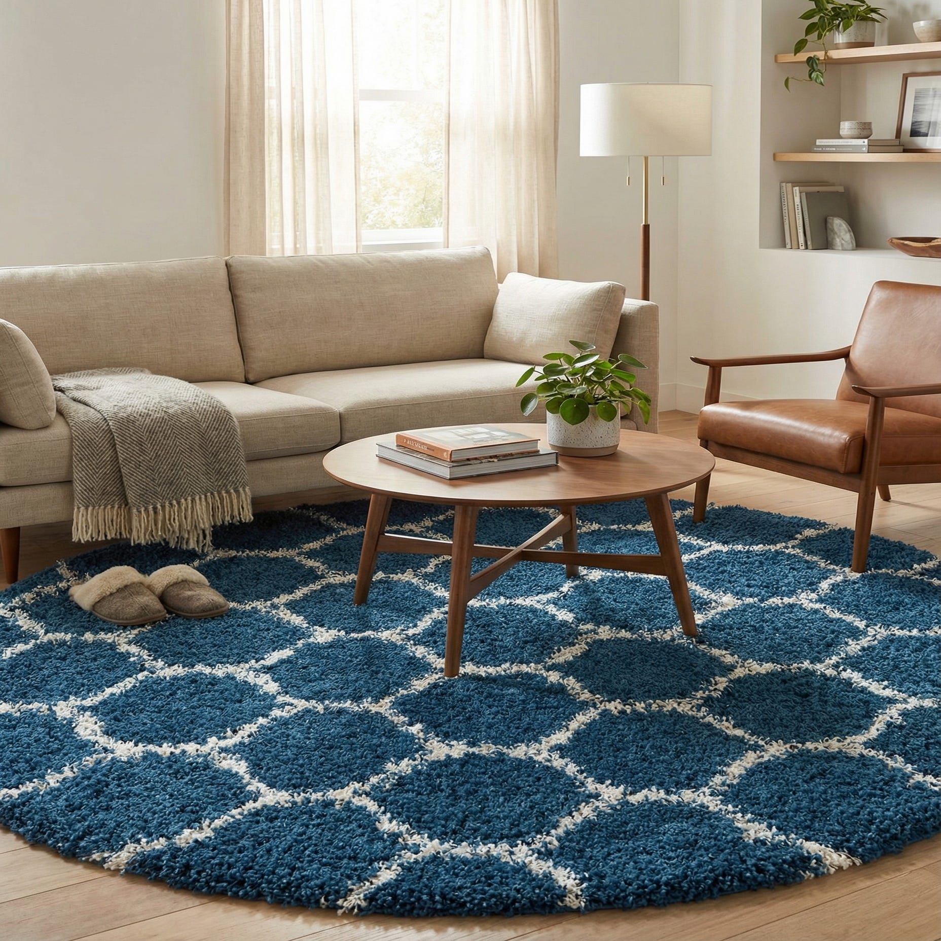 A round 6' 0 x 6' 0 navy blue shag rug with a white modern lattice pattern, showcasing its textured high-low pile.