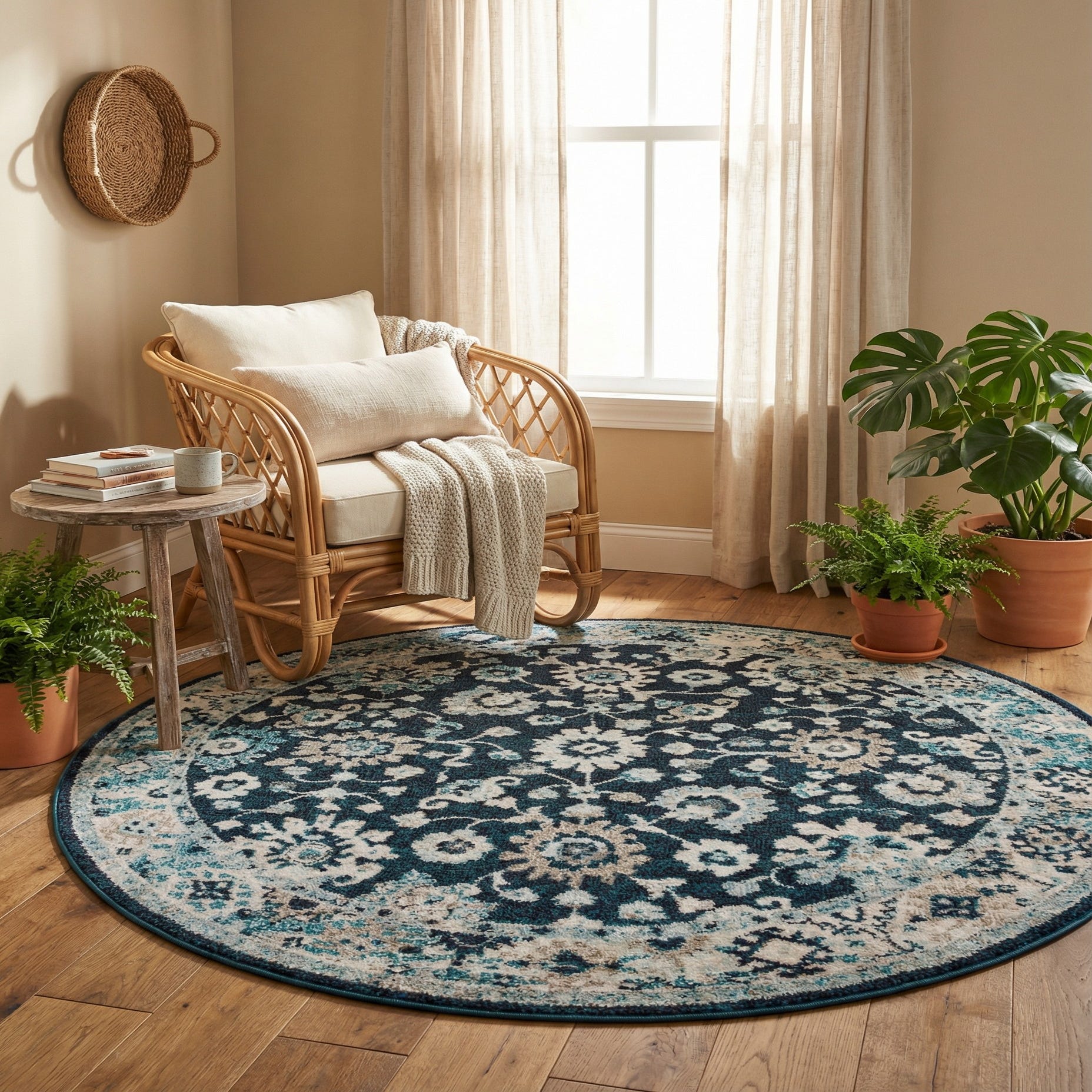 This round shape works well beneath a circular dining table, as an anchor for a cozy seating vignette, or layered in a bedroom seating area. It pairs naturally with light or medium wood tones, navy or ivory upholstery, and brass or matte black accents, fitting into traditional, transitional, or coastal-inspired interiors where a grounded, patterned element is desired.