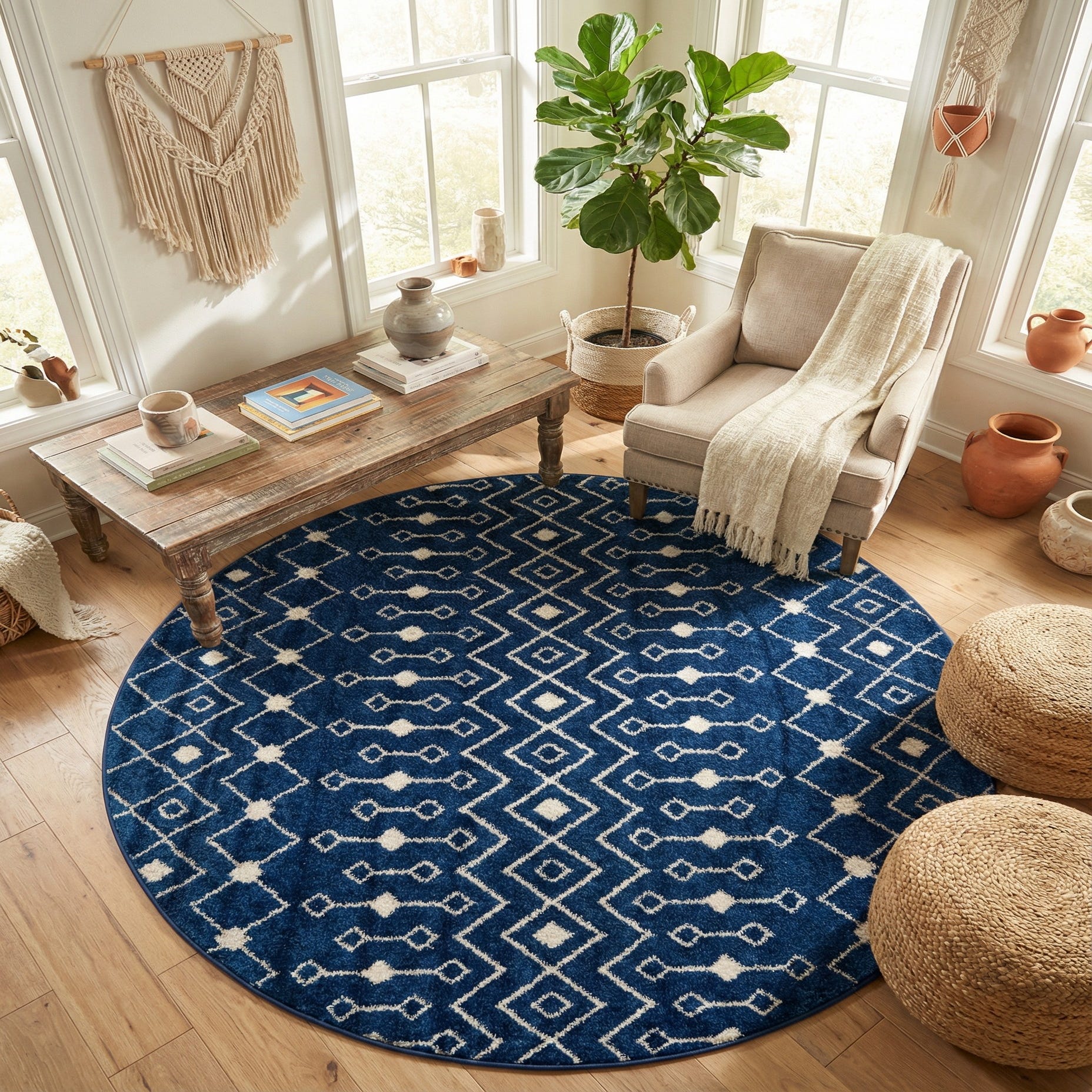 Works well beneath a round dining table or layered in a casual living area to ground seating arrangements. It also fits a bedside or reading nook, bringing color and pattern to smaller spaces. Pair with light wood furniture and neutral linens for a coastal or transitional look, or combine with mixed metals and navy accents for a contemporary, polished palette.
