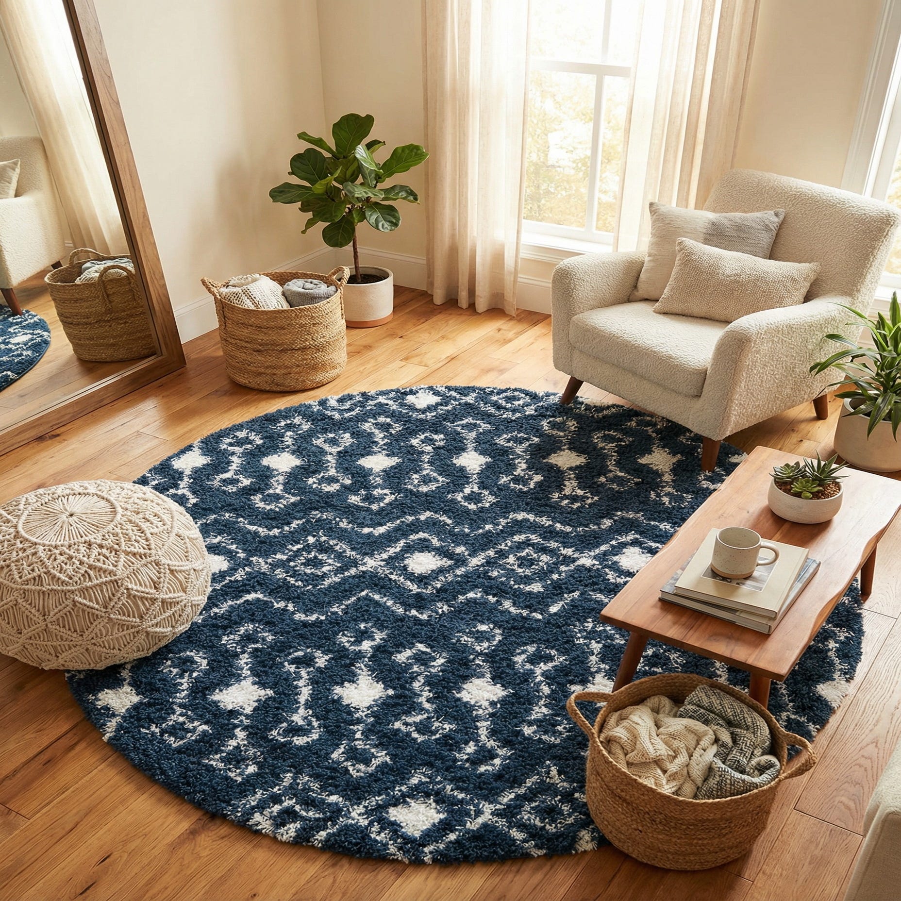 This Moroccan Trellis Shag rug would be a standout addition to a variety of decor styles, particularly complementing modern, contemporary, and transitional interiors. Its bold color scheme can serve as an anchor in a predominantly neutral palette or as a sophisticated complement to a nautical or coastal theme. Given its inviting texture and round shape, it would be especially well-suited to a reading nook, beneath a small dining table, or in an intimate seating area where it can bring a sense of comfort and define the space.