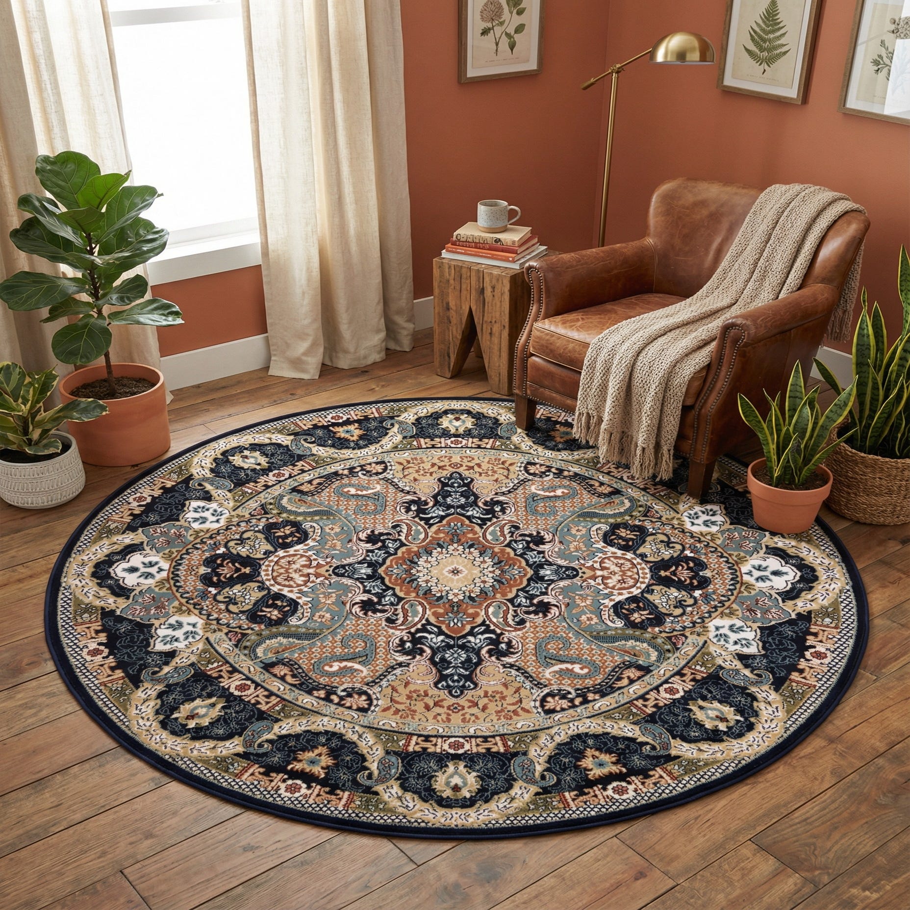 Woven from 85% polypropylene and 15% polyester, the construction offers a low-to-medium pile with a smooth, slightly plush hand that’s pleasant underfoot. Place it beneath a round dining table or in a cozy breakfast nook to define the space, center it in a living area to anchor seating, or set it under a bed to introduce color and pattern to the bedroom. It pairs naturally with warm wood furniture, navy or cream upholstery, and metal finishes in brass or aged gold, working equally well in traditional rooms or transitional interiors that blend classic pattern with contemporary furnishings.