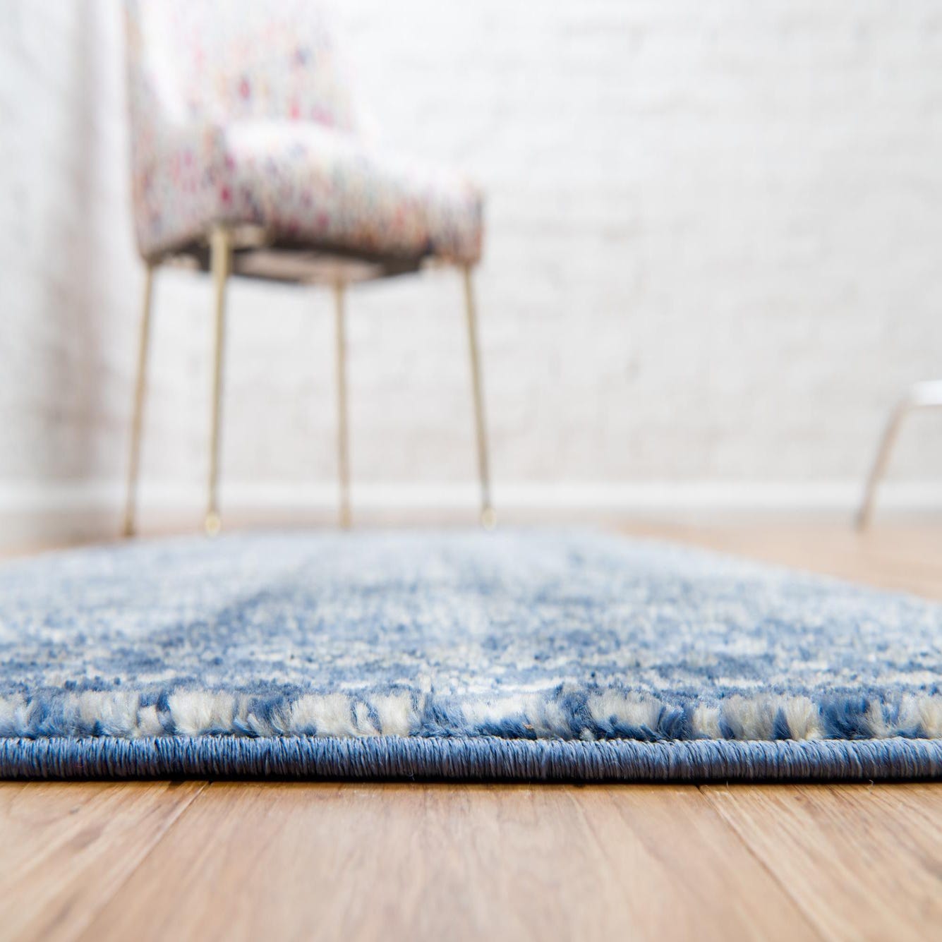 A banded, slightly distressed pattern gives this runner a lived-in, layered look with rhythmic rows of geometric motifs and soft floral accents. The background is Navy Blue, accented by lighter Blue and Ivory highlights that are woven with space-dyed yarn for subtle tonal variation across the surface. Machine made from 100% polypropylene, the construction produces a low-profile pile that feels soft underfoot while maintaining a gentle texture you can both see and touch.