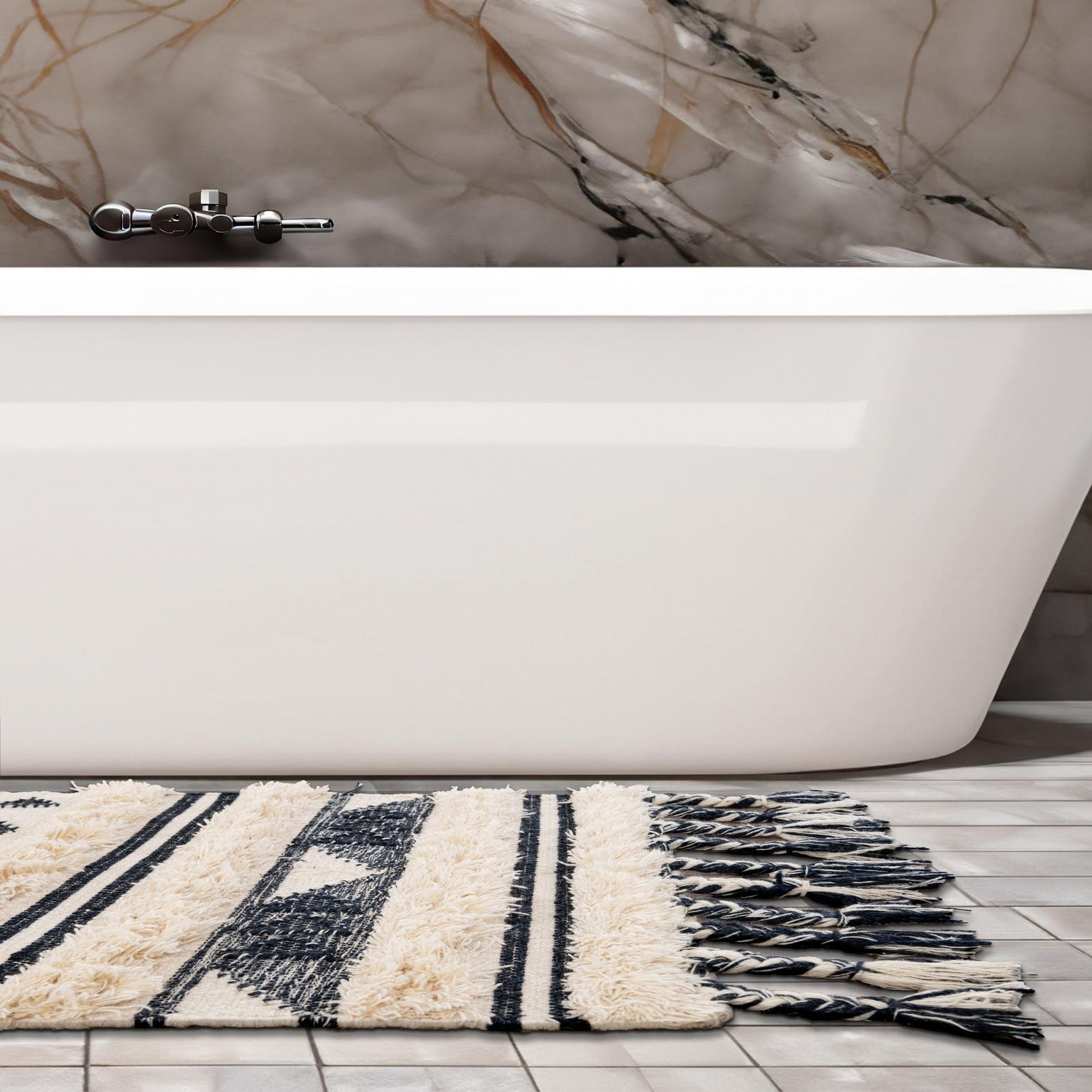 A 6 ft runner rug from the Arizona Collection, featuring a tribal and modern bohemian stripe pattern in navy blue and off-white with shag pile and braided tassels.