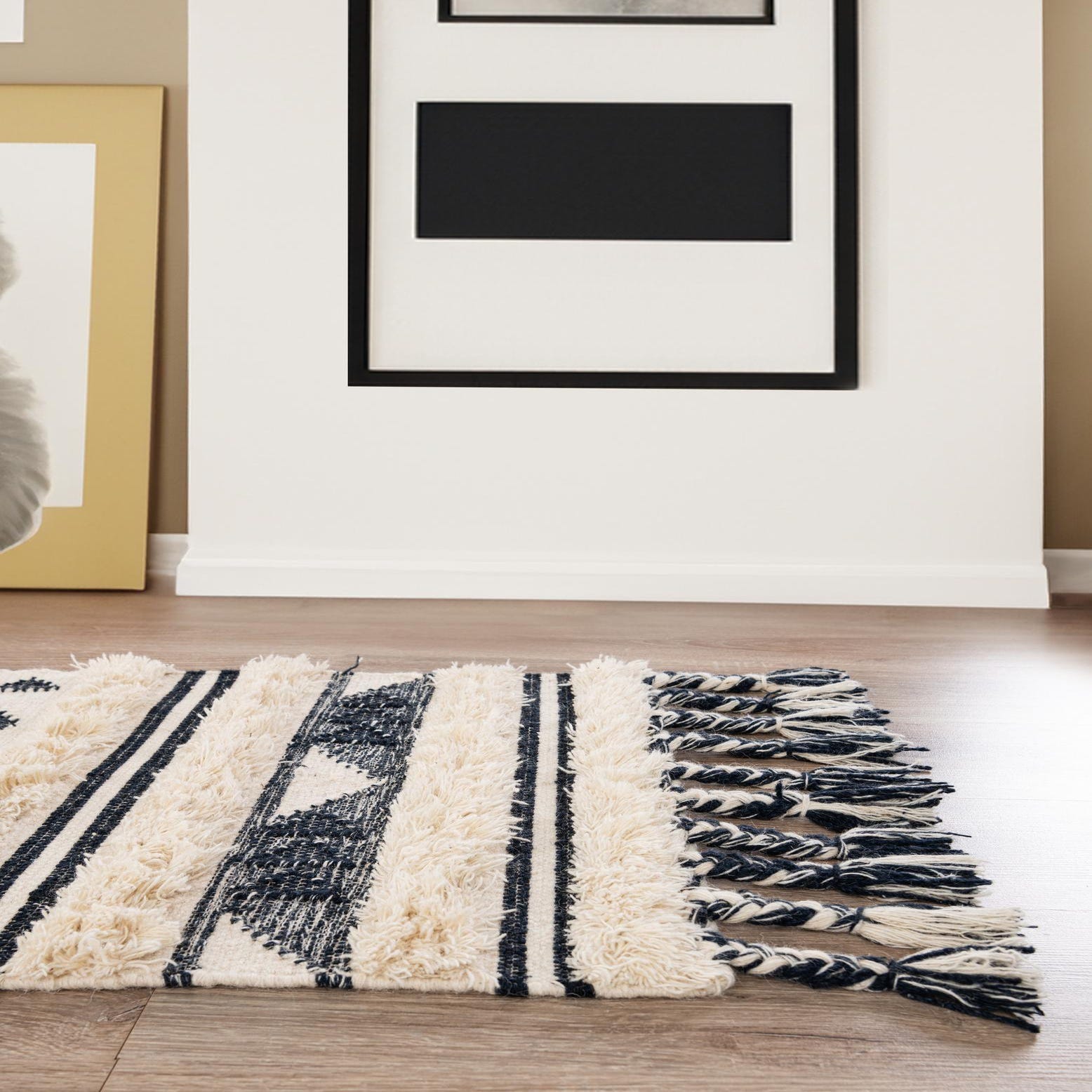 Hand-woven from 100% wool, this runner presents a navy-blue ground punctuated by cream geometric bands and small tribal-inspired motifs. The construction alternates tightly woven sections with soft, raised shag strips, creating a subtle, tactile contrast you can feel underfoot. Braided navy-and-cream fringe at each end completes the piece with a handcrafted touch.