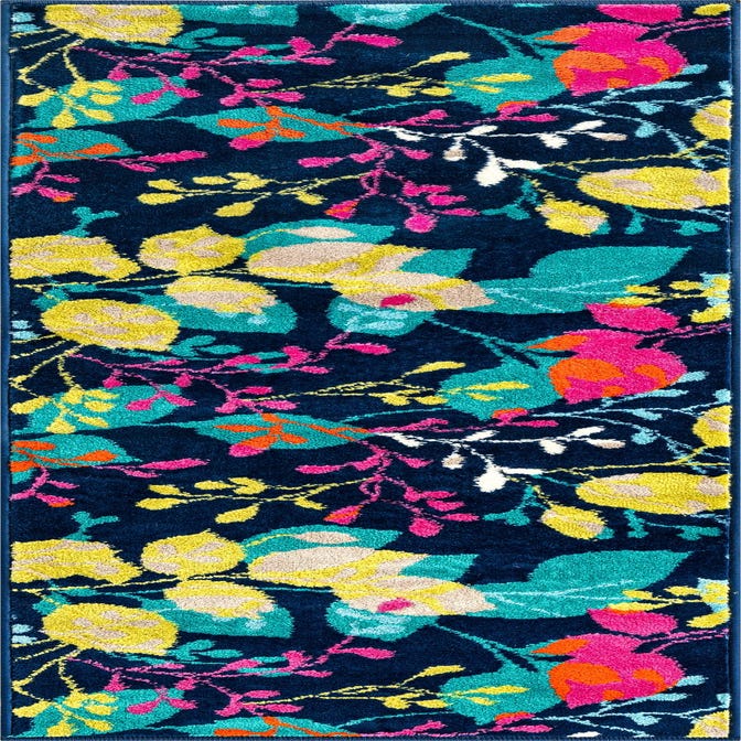 A 6 ft runner rug with a navy blue background and a vibrant modern floral pattern in pink, yellow, teal, and orange.