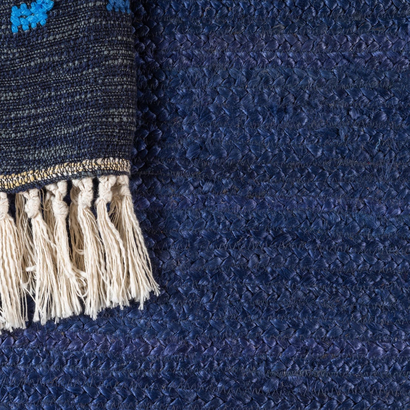 Deep navy blue braided rows form a quietly structured runner with a tactile, low-profile surface. Hand-braided from 100% jute, the rug's linear pattern creates subtle ribbing and tonal depth as the natural fibers catch light differently across the weave. The texture is firm underfoot with a slightly coarse, organic feel that brings natural warmth and visual weight without adding pile.
