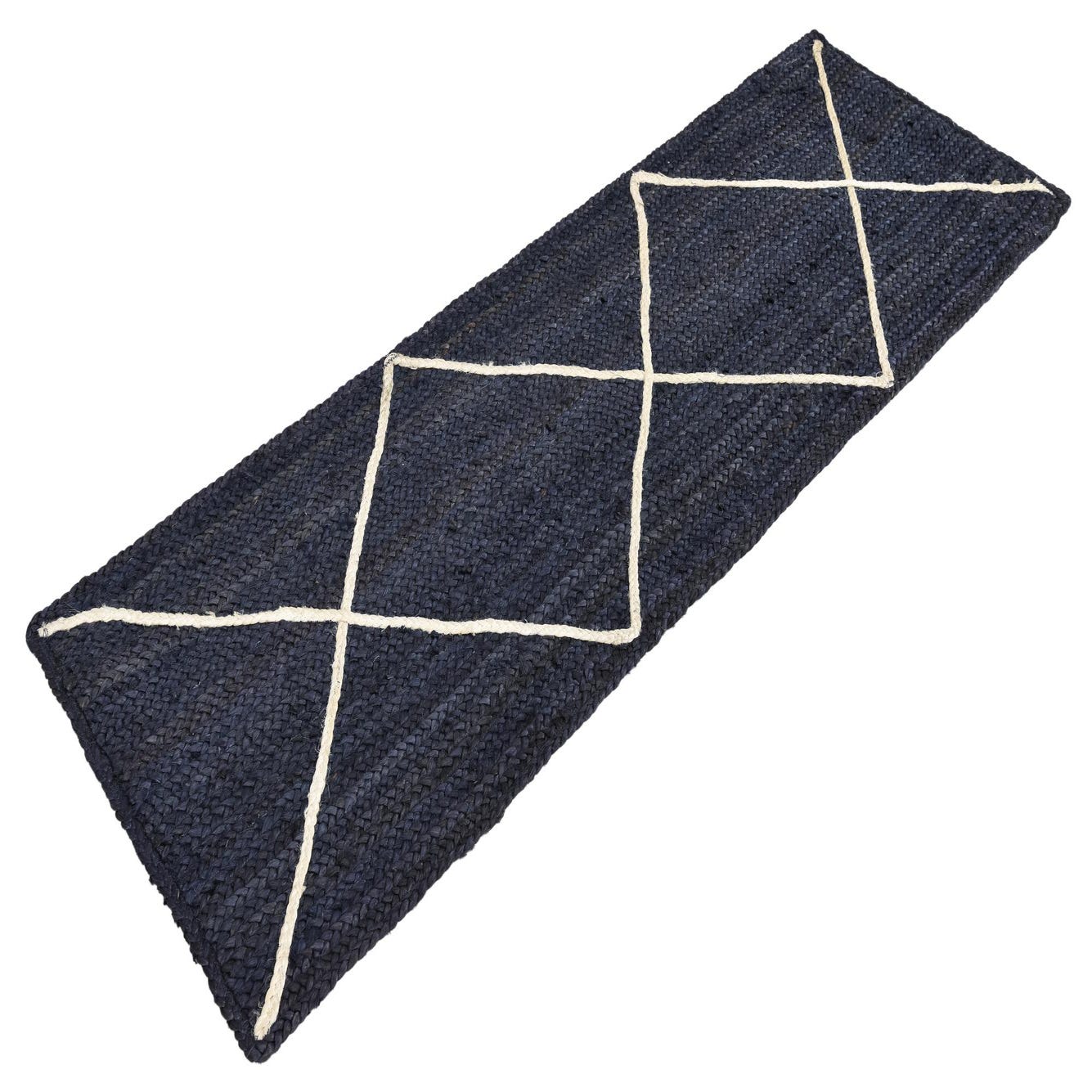 A 6 ft runner rug in braided navy blue jute with a prominent white diamond pattern, ideal for a hallway.